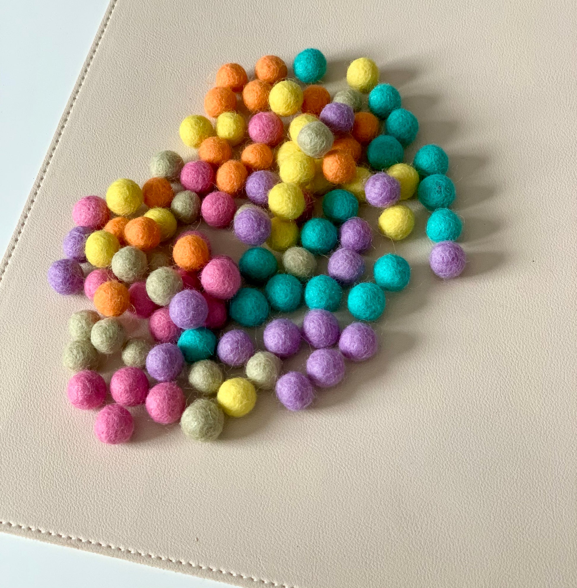 100 felt balls. Each ball is approximately 1 cm to 1.2cm in size.