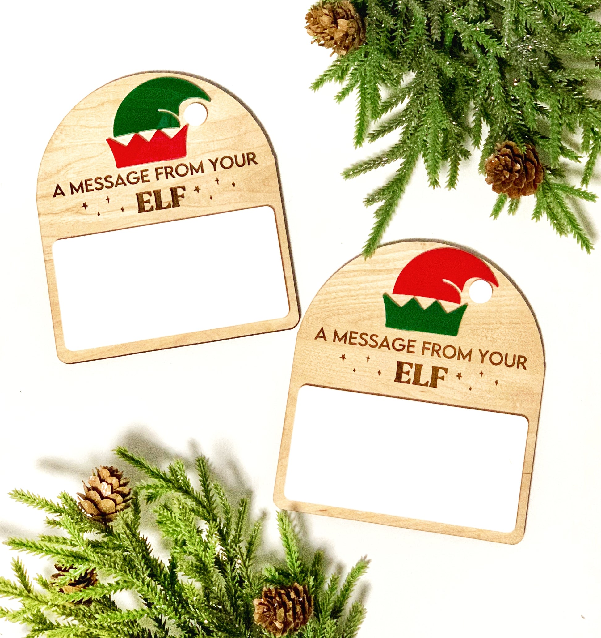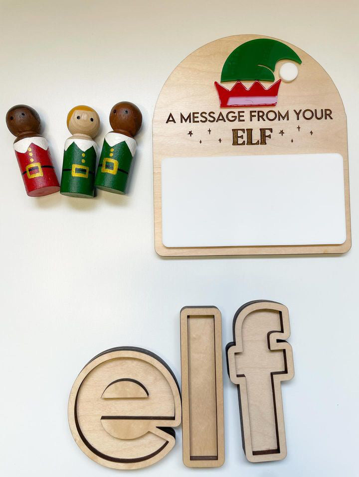 This sign is a fun way to send a quick message to your little one from their Elf! The white rectangle can be written on with a dry erase marker. We would love to make one for you!