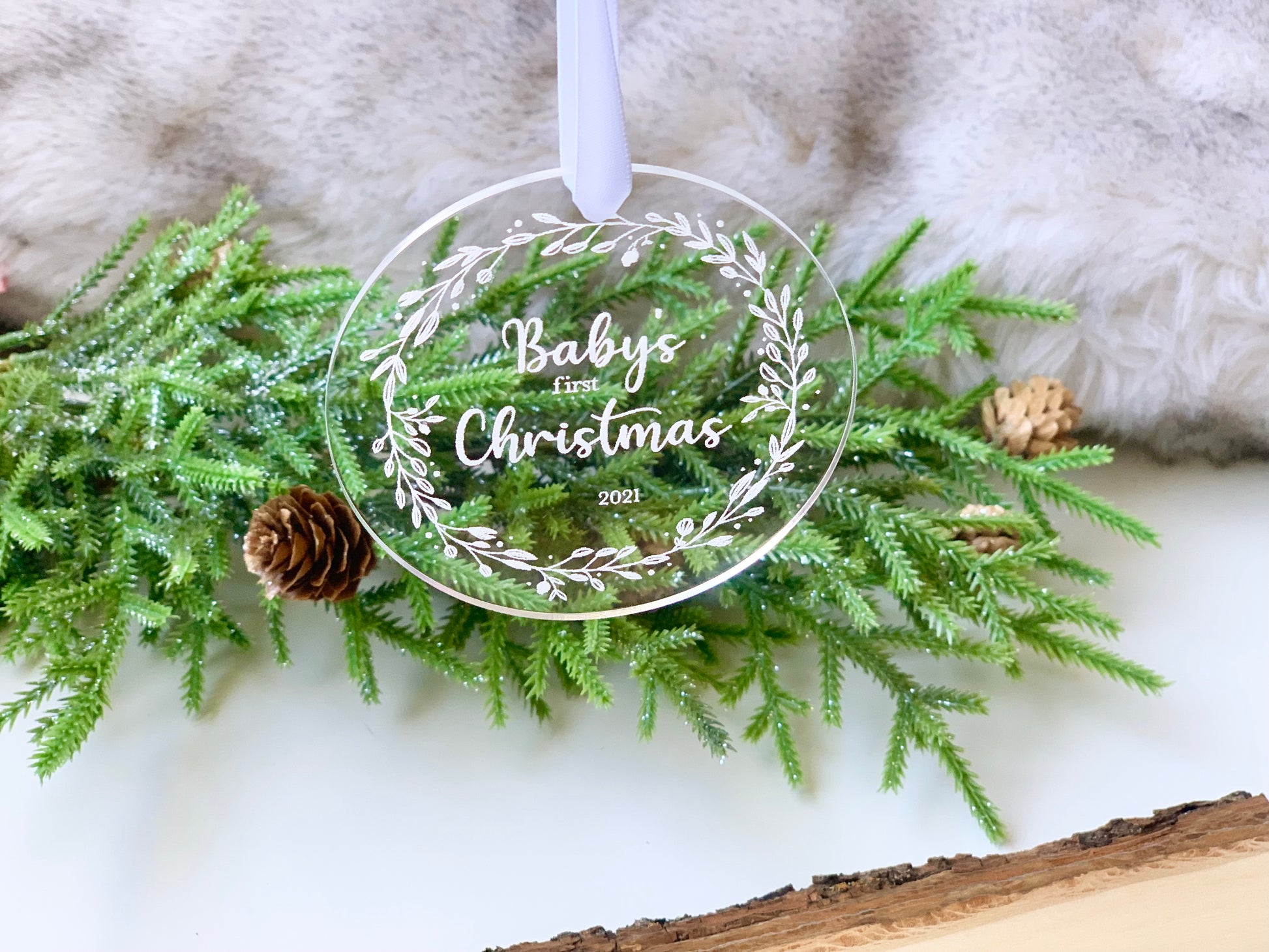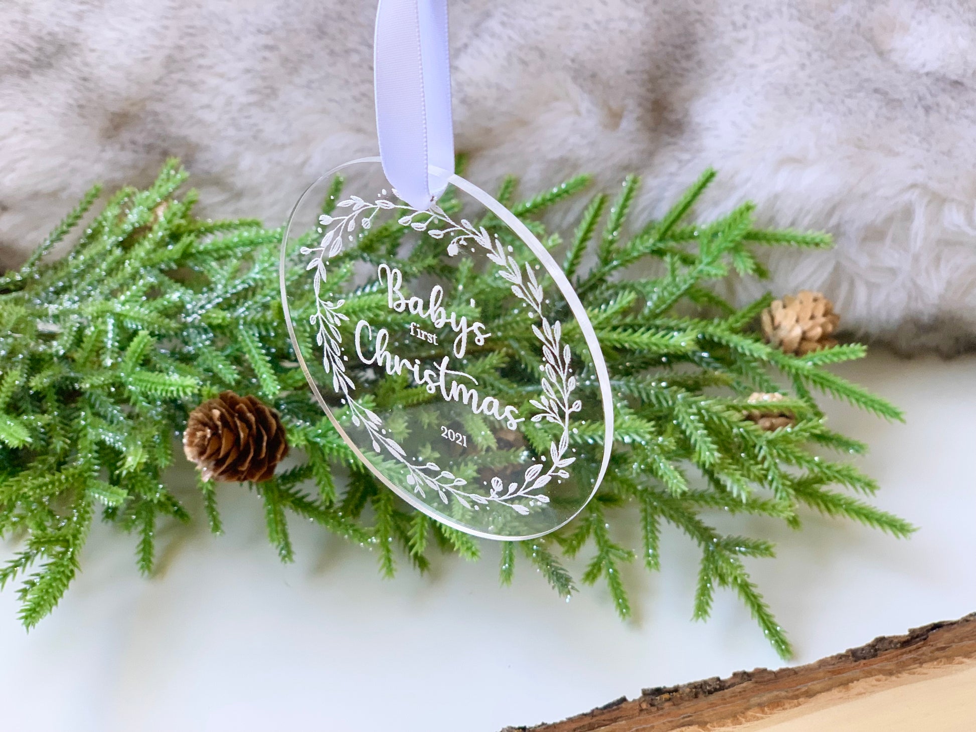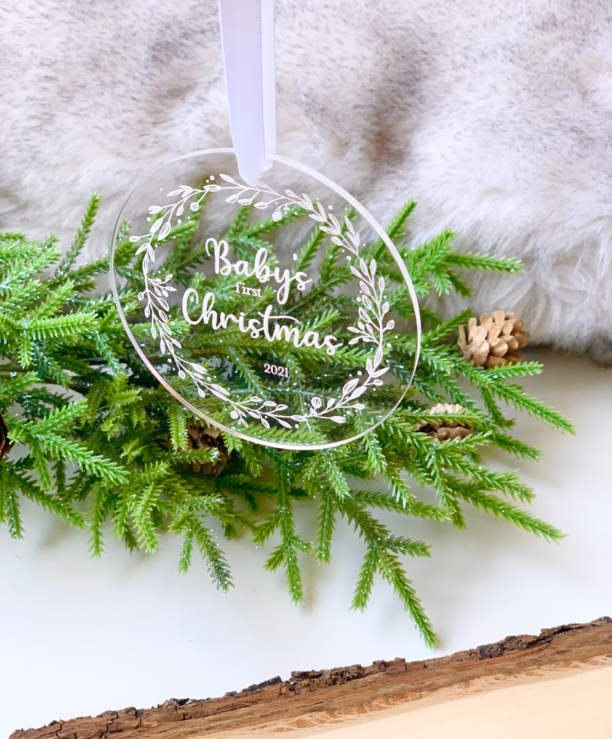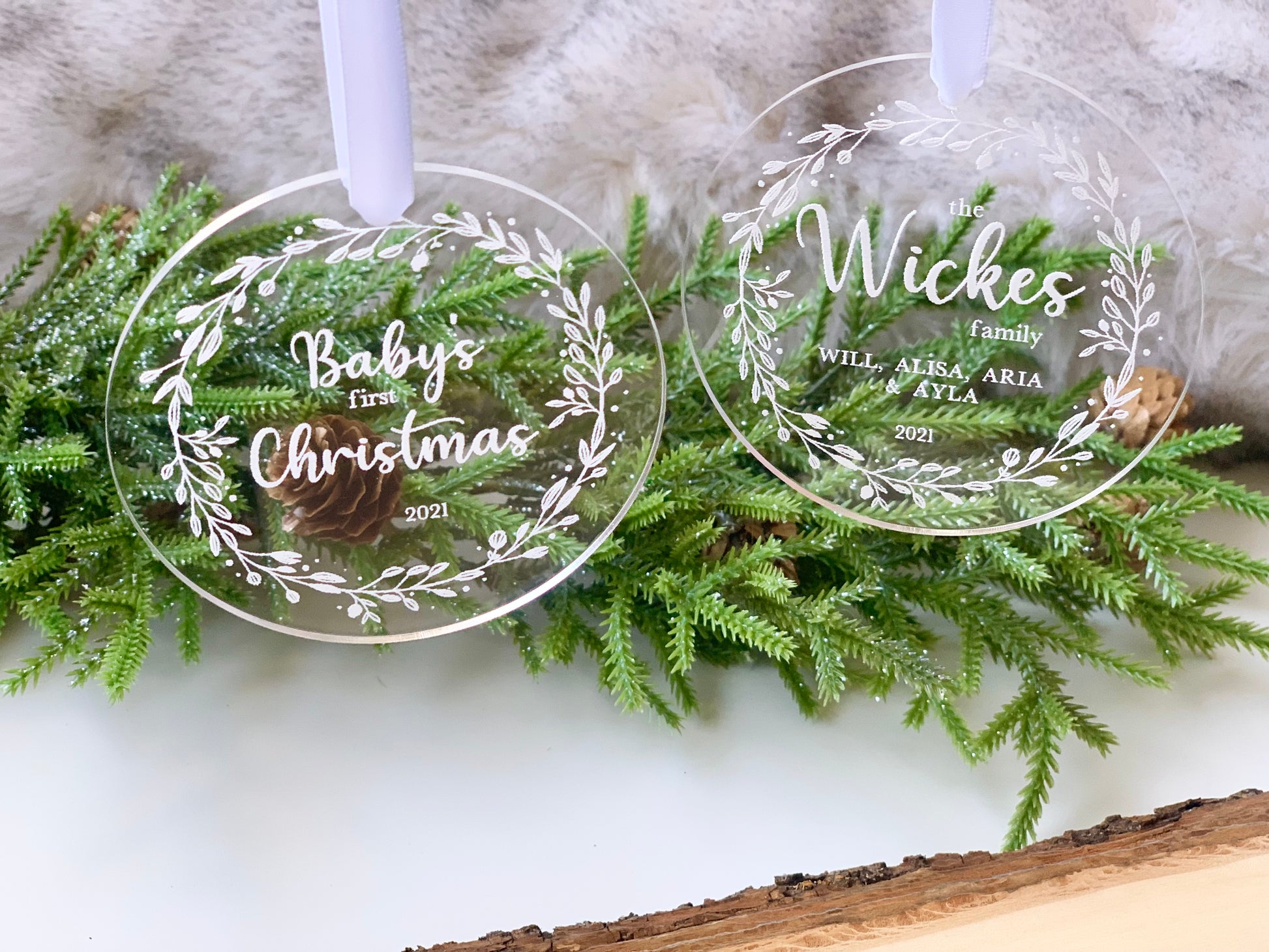 Each ornament is from 1/8” acrylic and engraved. Approximately 3.5” big.