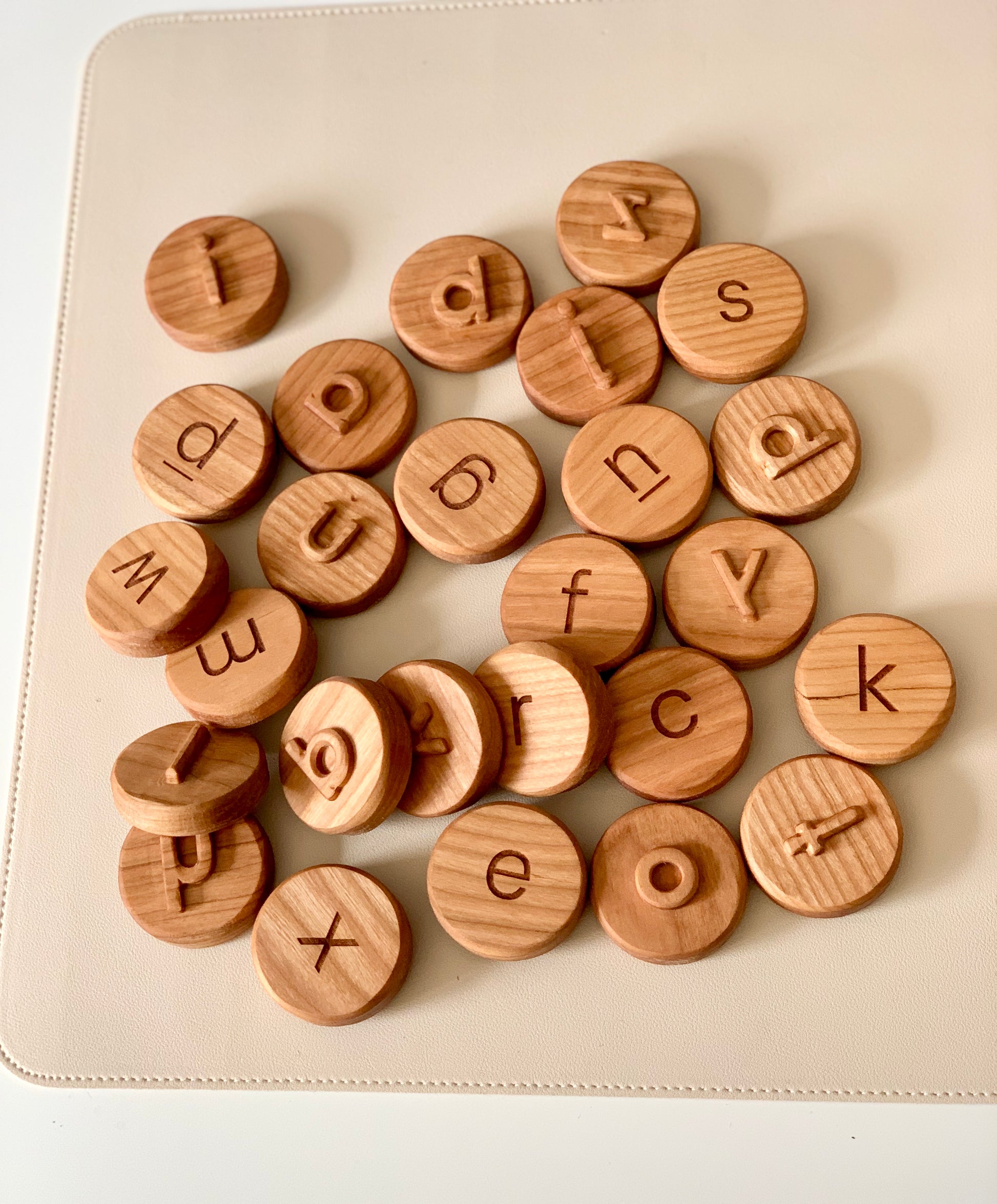 🌈 26 Lowercase Letter Alphabet Stamps — 2 inches in diameter, 3/4” thick, all made from one solid piece of cherry hardwood.