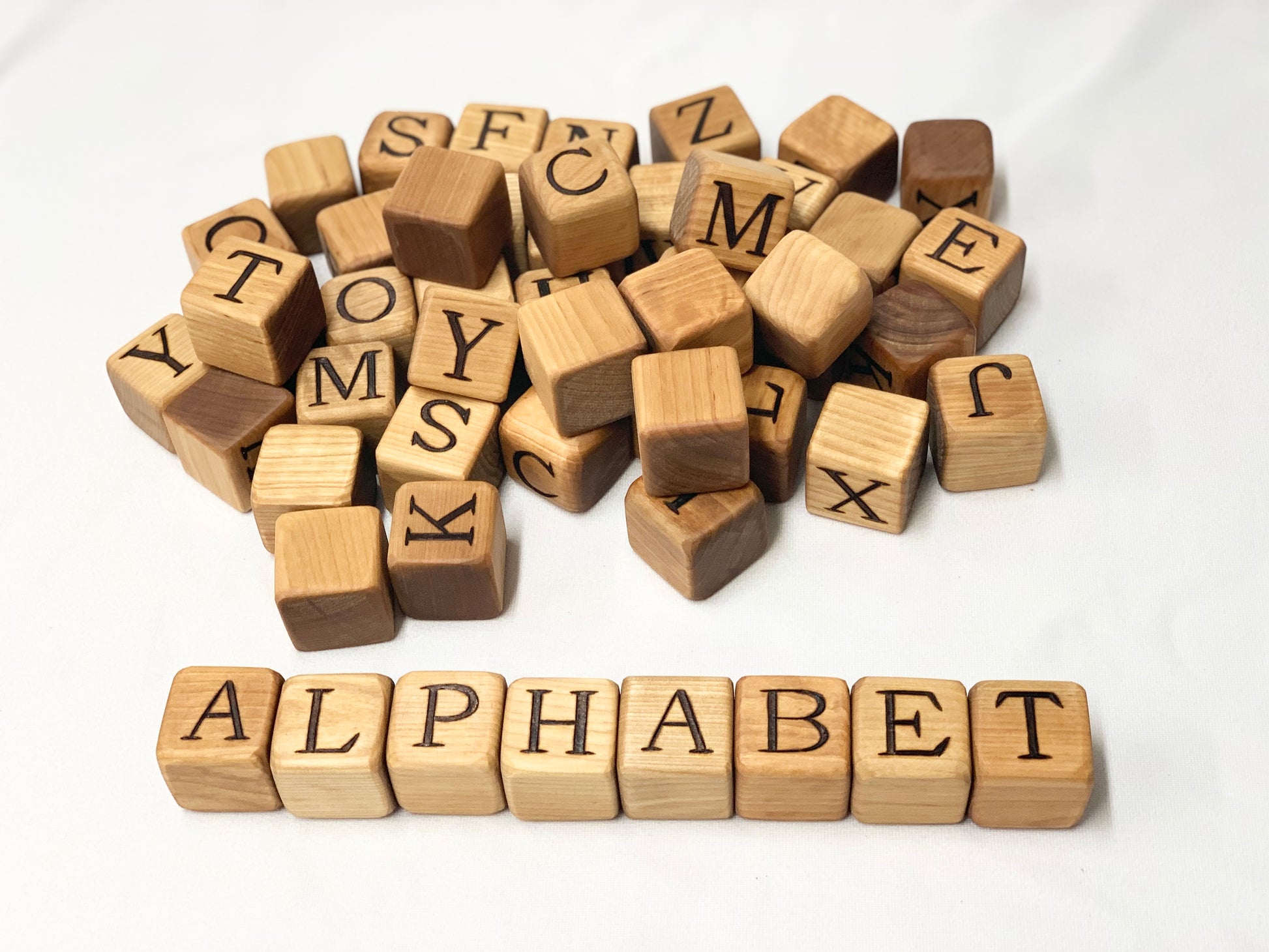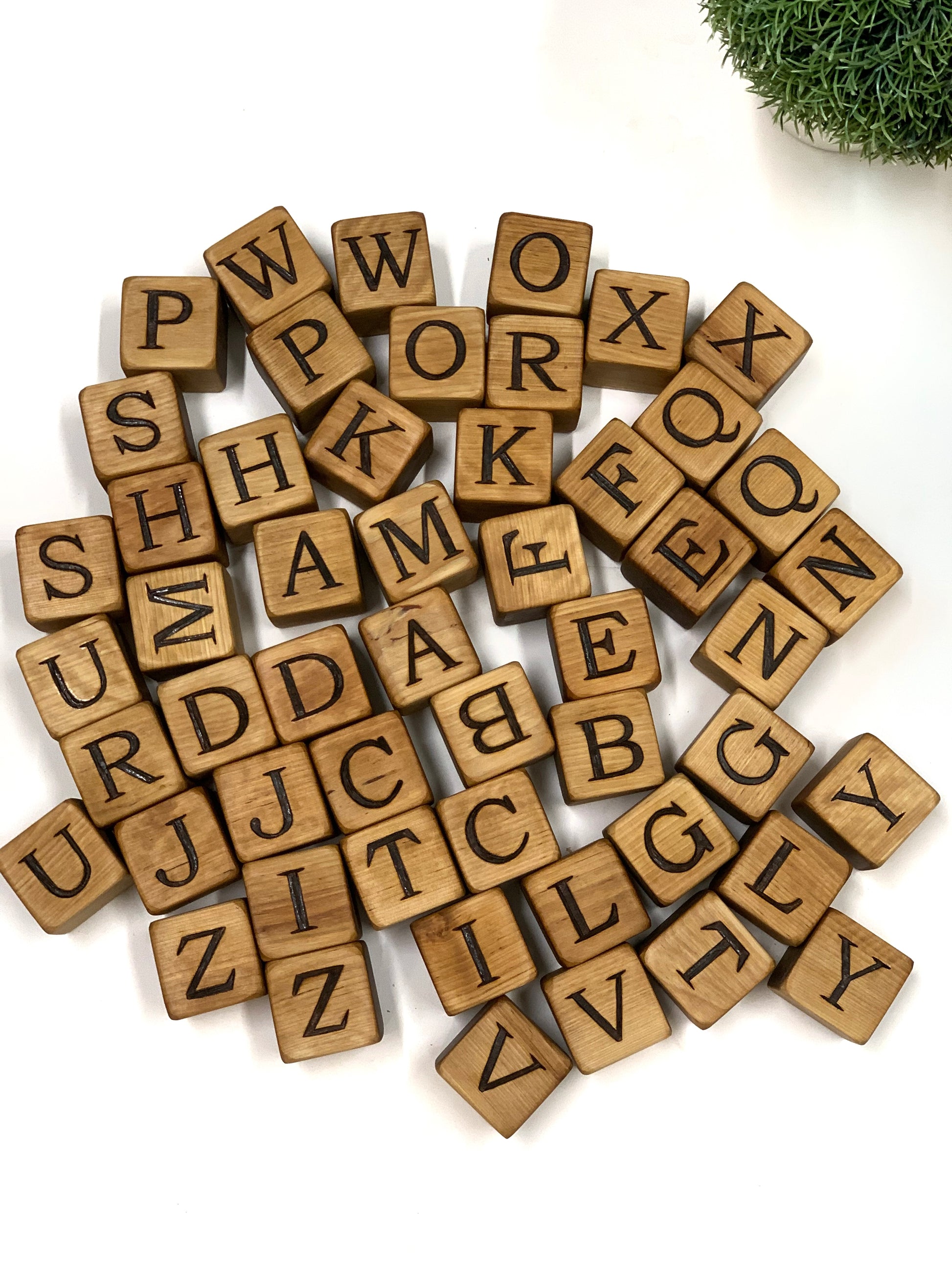 We offer two sizes of blocks. They are sanded by hand to smooth out the edges, and each letter is hand drawn and hand burned onto the wood block. I do not use any stencils or stamps in my process. The burning tool and wood blocks are completely non toxic, and are finished with an FDA approved, certified Kosher Natural Non-Toxic Wood Oil.