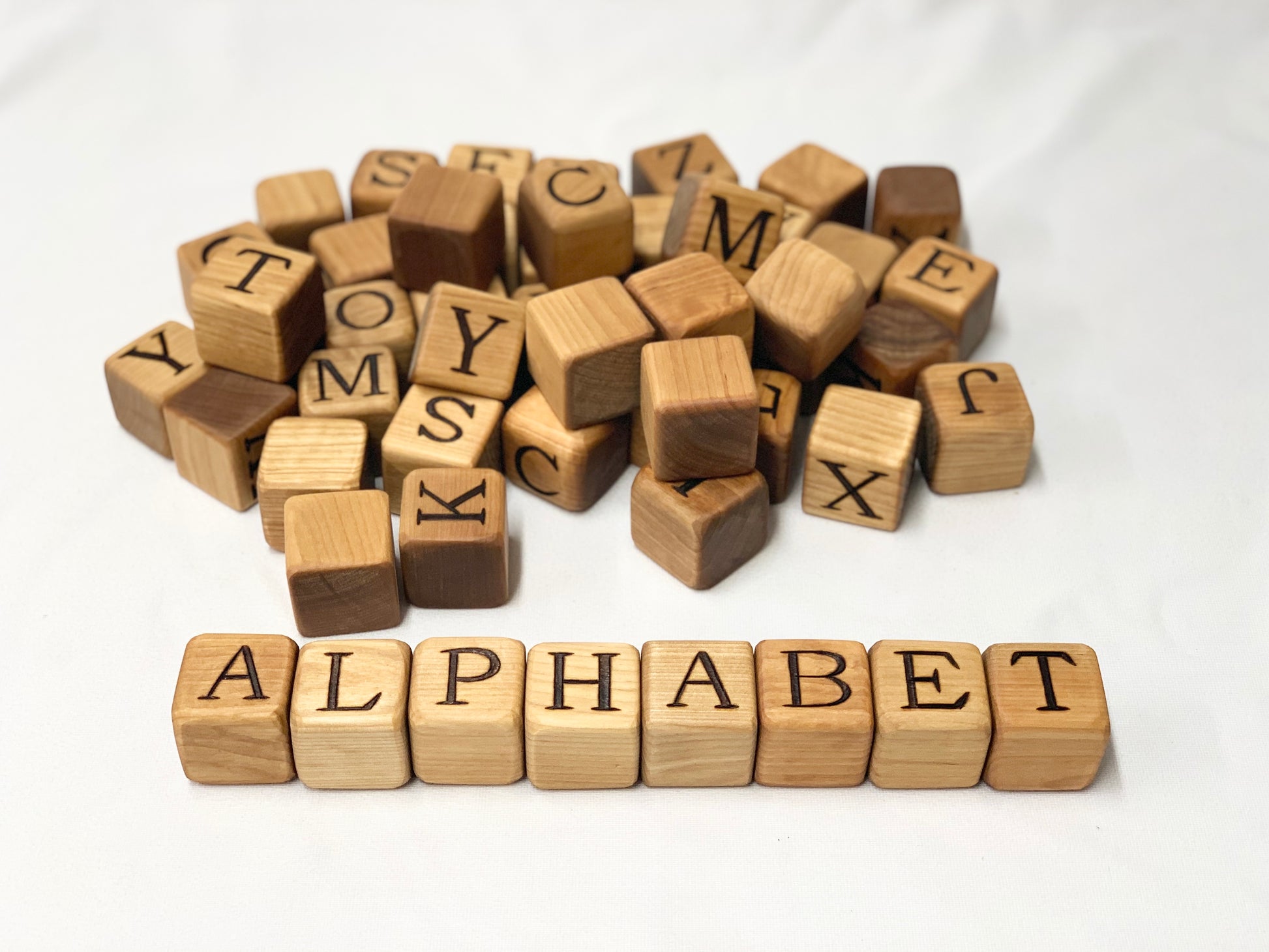 This set includes 26 blocks with one letter of the alphabet on each block. Please remember these are hand drawn and hand burned, and not done with a laser engraving machine.