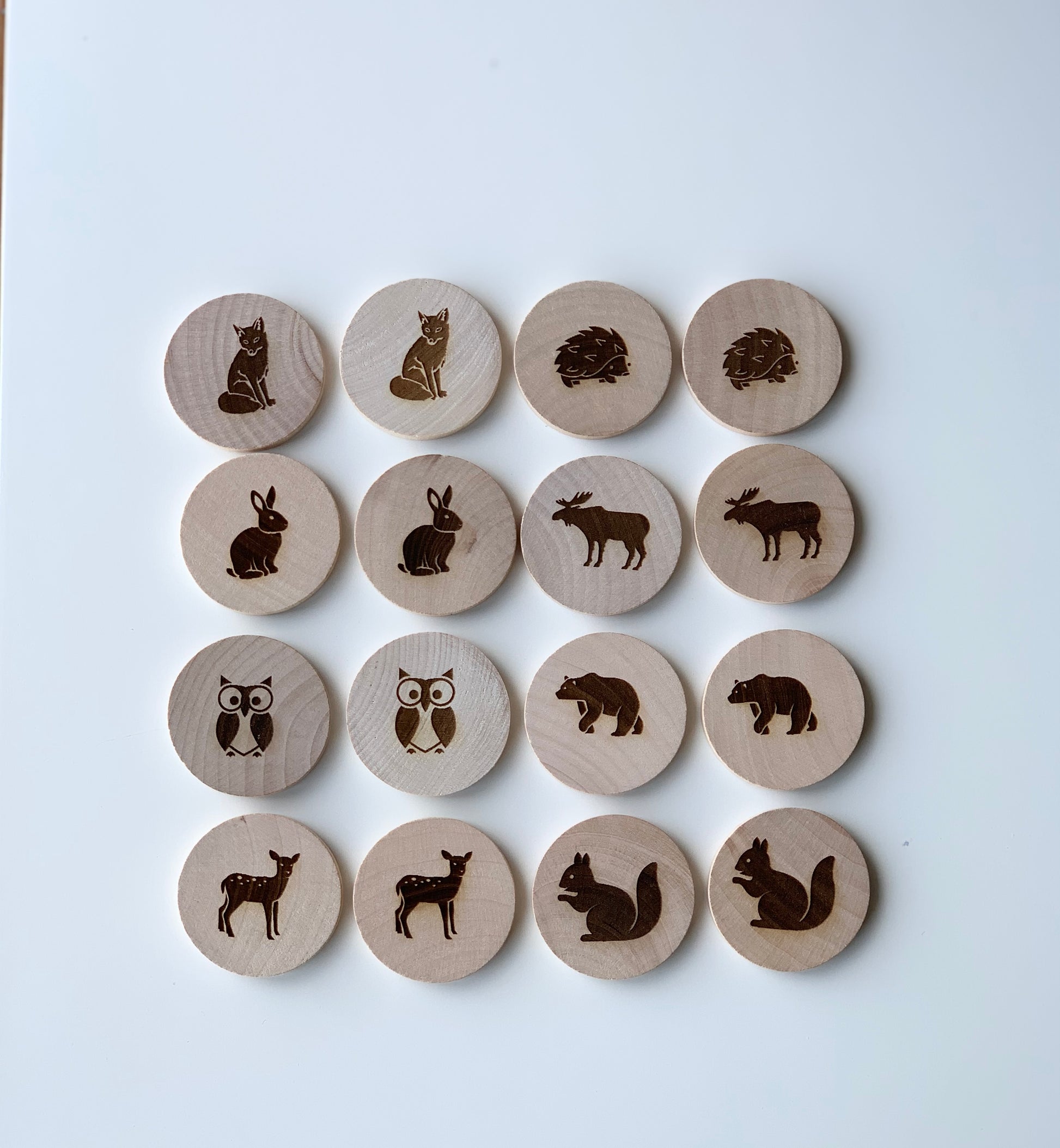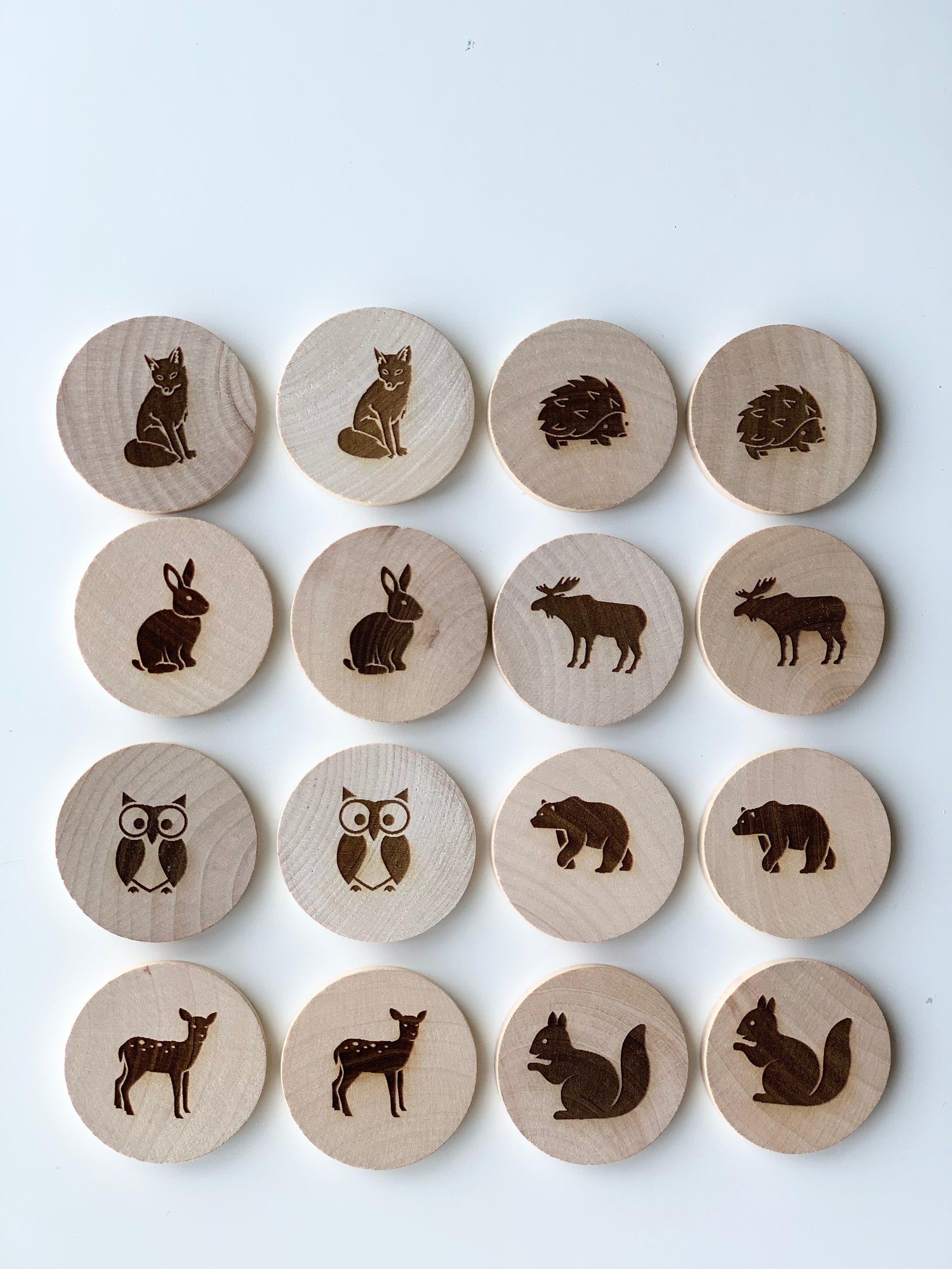 Memory games are a perfect educational toy for your little ones! In addition to using them as a traditional memory game - use them as little storytelling coins ⚡️🌈. Each time you pull a coin out of the bag - add a new sentence to your story, using the image as inspiration. Or - make musical & rhythmic sounds by tapping them together or plopping them into an empty Kleenex box. The possibilities are endless. These are wood burned with a laser machine and coated in a non toxic wood oil — completely eco friendly long lasting heirloom toys 🌿. Oh, and made with the most love ❤️
