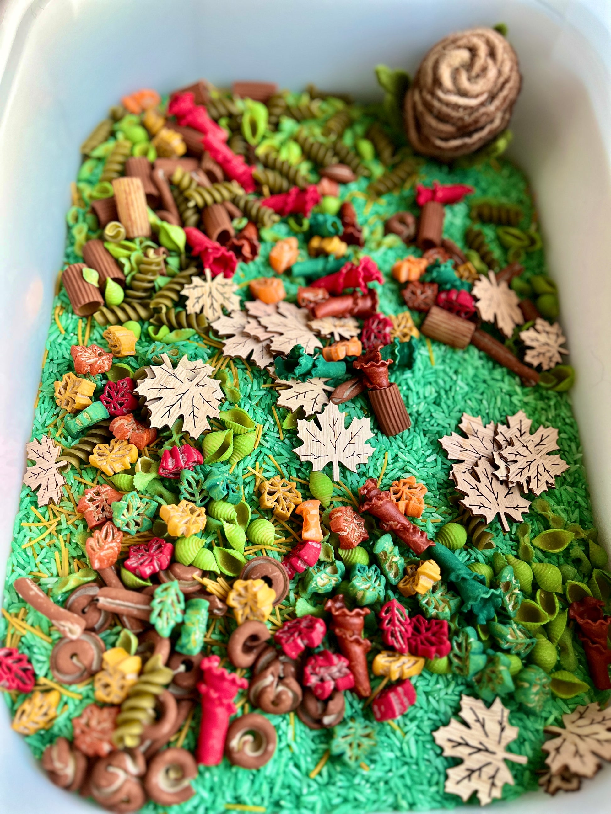 Autumn hues sensory filler is so much fun! Who can resist playing in leaves? Lots of great textures and a few fun surprises makes it great entertainment on a cool, rainy day.