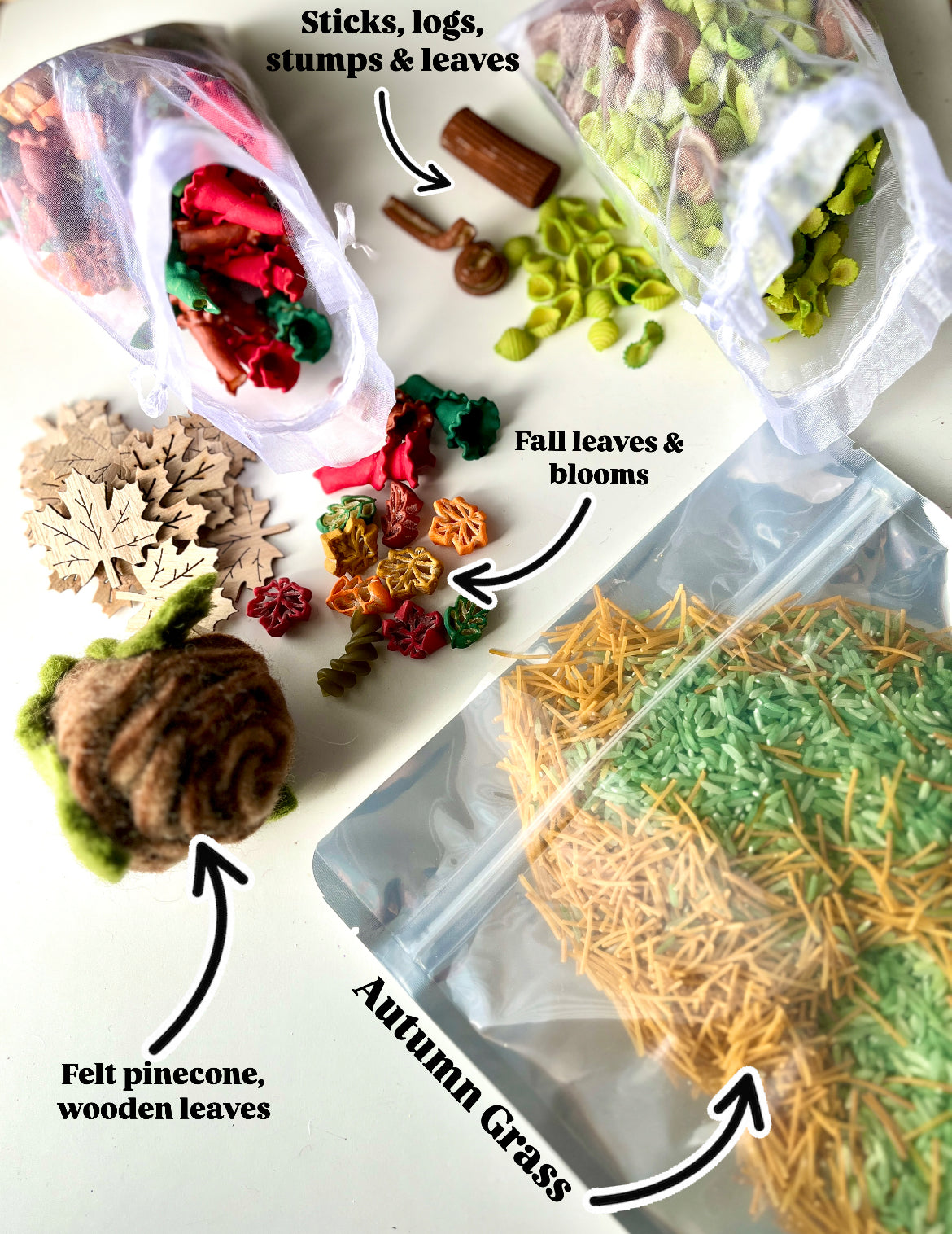 Each Kit comes with over 6 cups of filler, comprising of various rice and pastas. The bloom looking pasta is individually hand painted. It also comes with wooden leaves and a felt pinecone. This kit comes with a lot of leaves and blooms. If you purchased a bag of our fall / autumn grass filler, you could easily make a second bin.