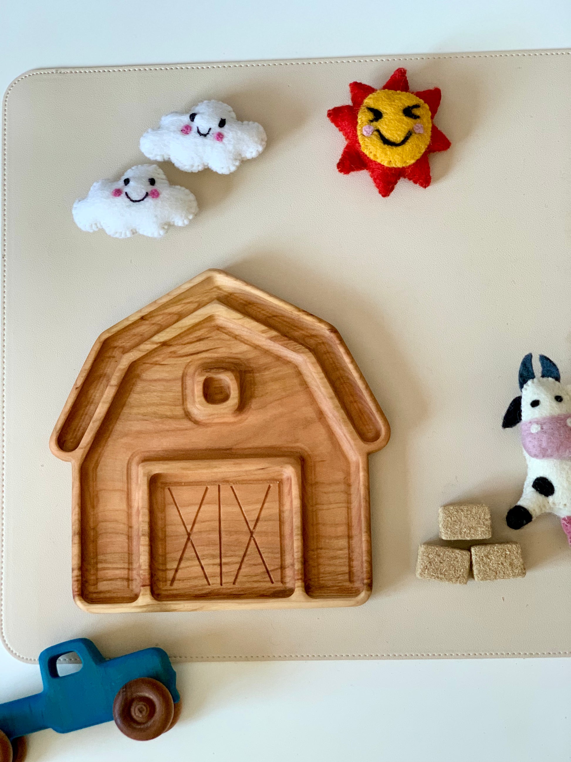 The tray is expertly crafted to resemble a classic barn, complete with a pitched roof, double doors, and charming details. Encourage imaginative play with miniature farm animals and accessories such as cows, horses, chickens, and fences. These figures bring the barn to life, inspiring storytelling and role-playing. We carry felt farm animals on our s i t e !