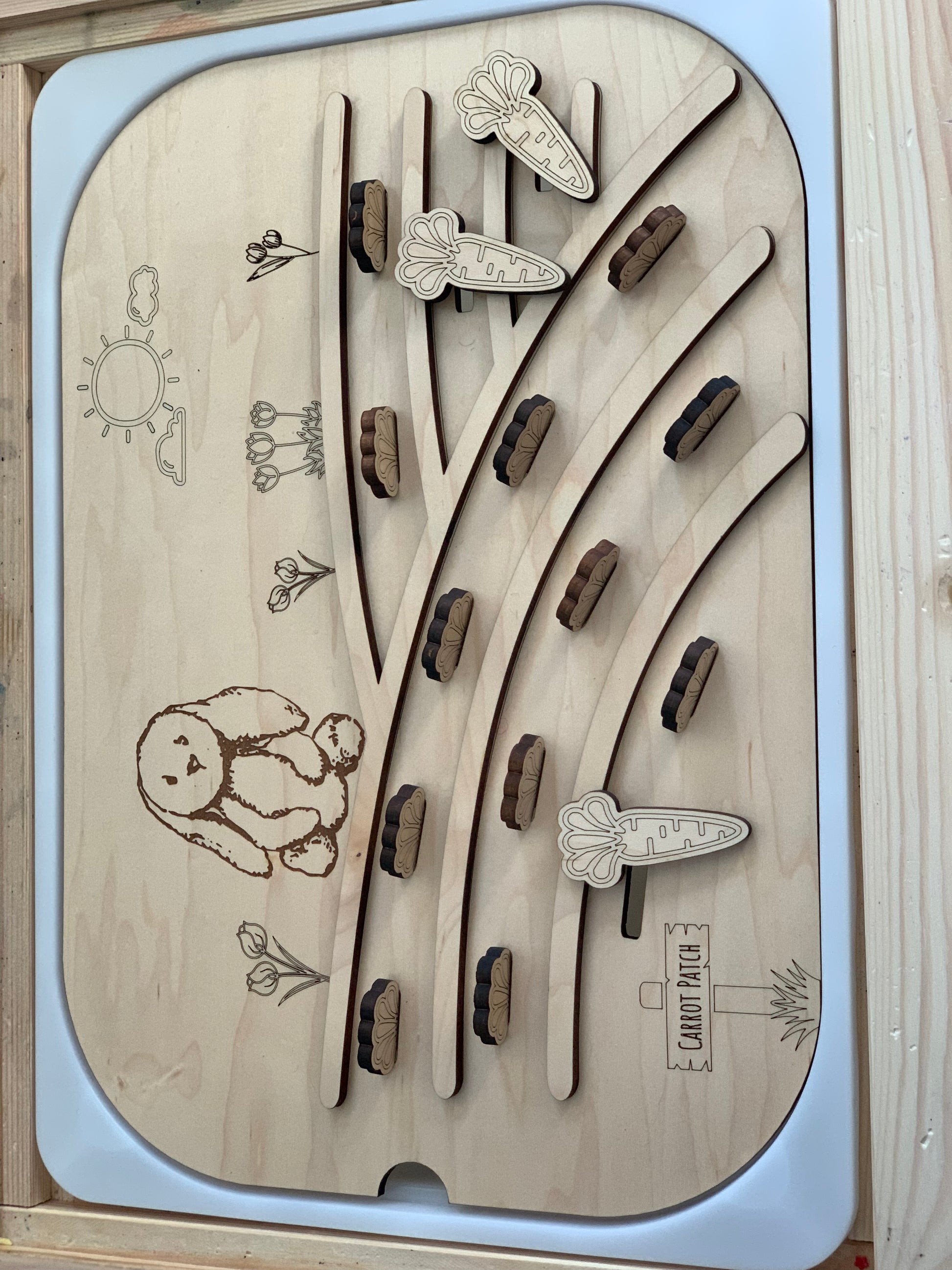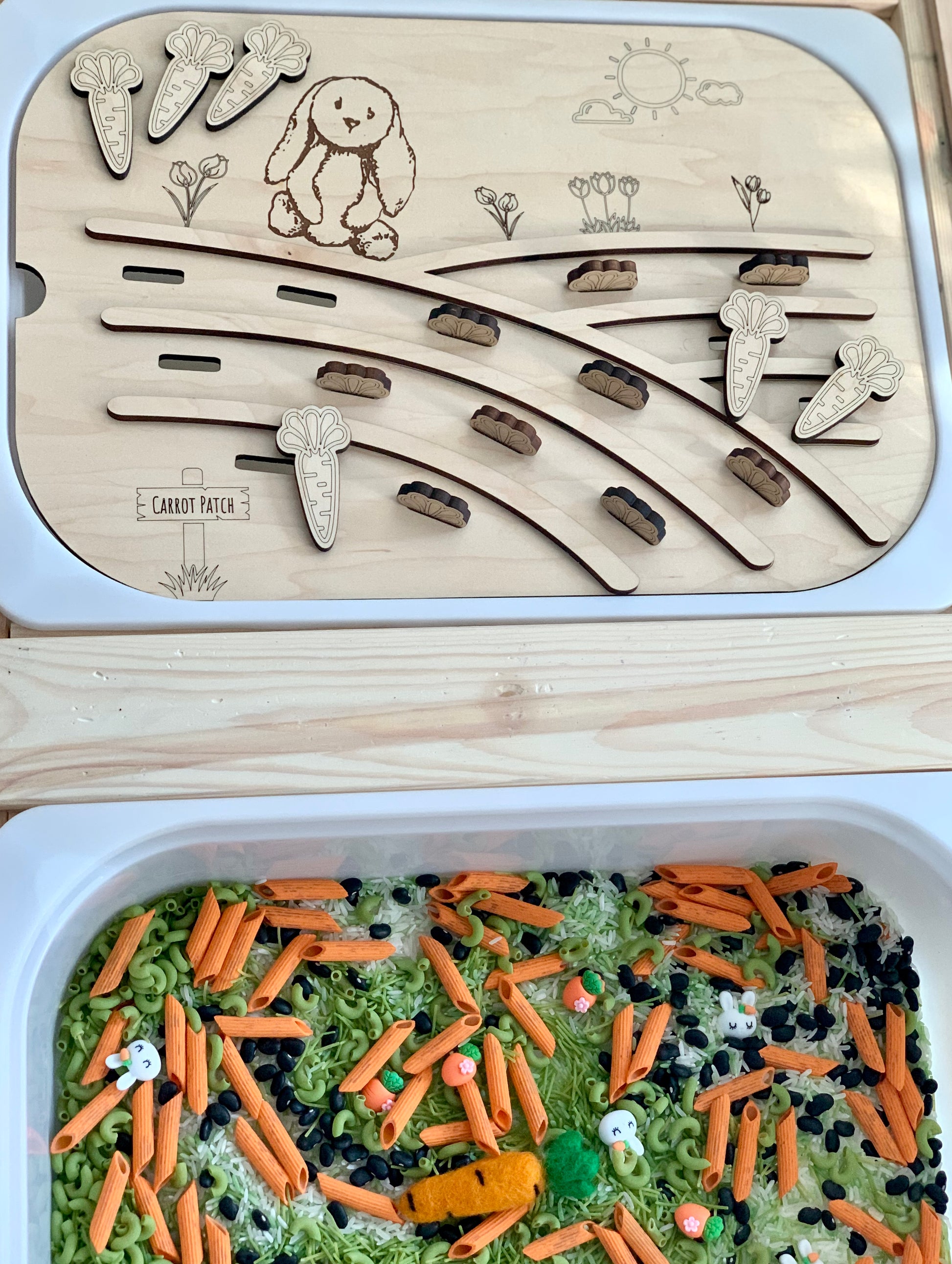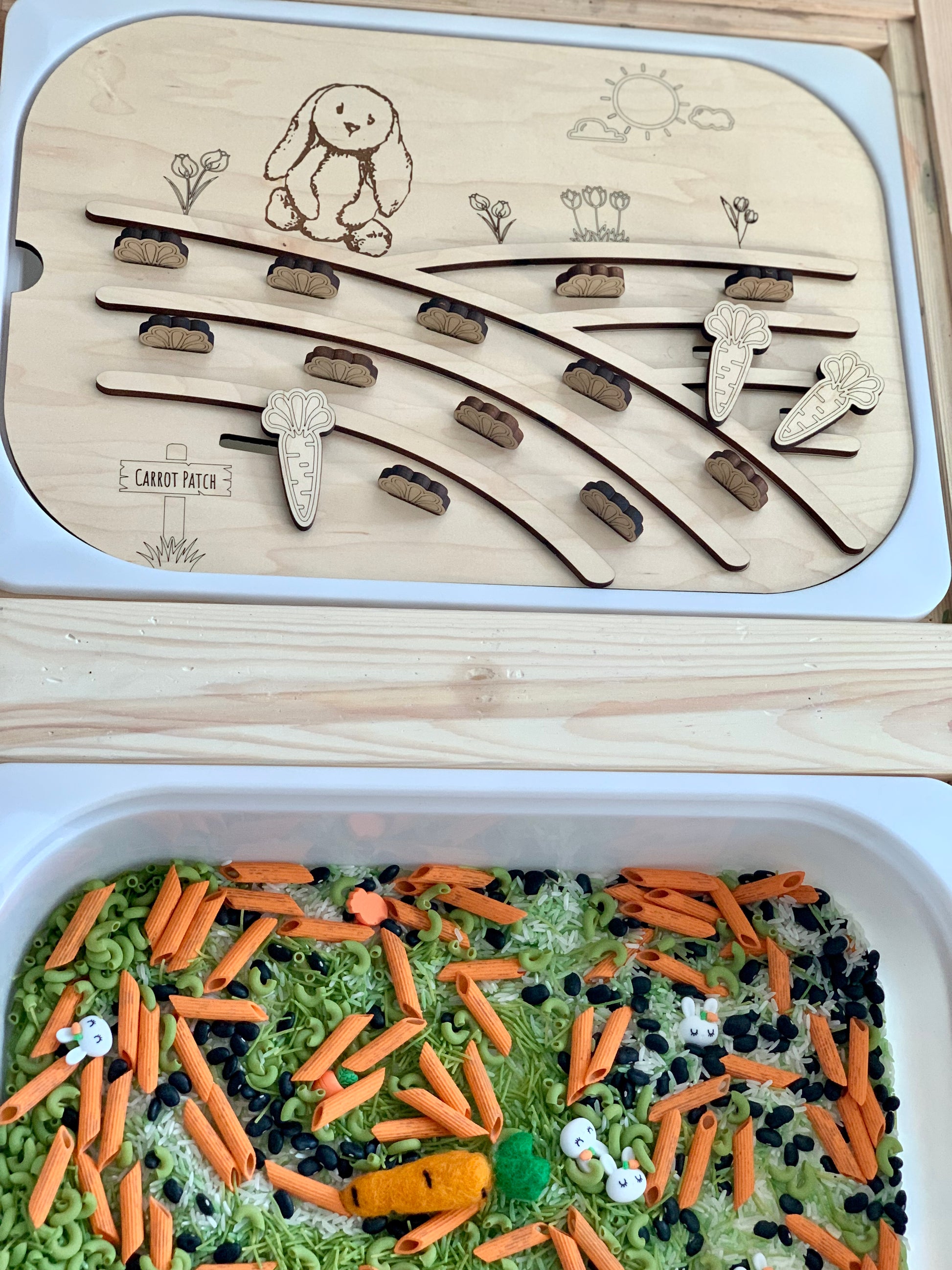 This insert is designed to fit the large Flisat/Trofast bin. It comes with 15 “plantable” carrots. Pictured here with our Carrot Patch Fun Filler.