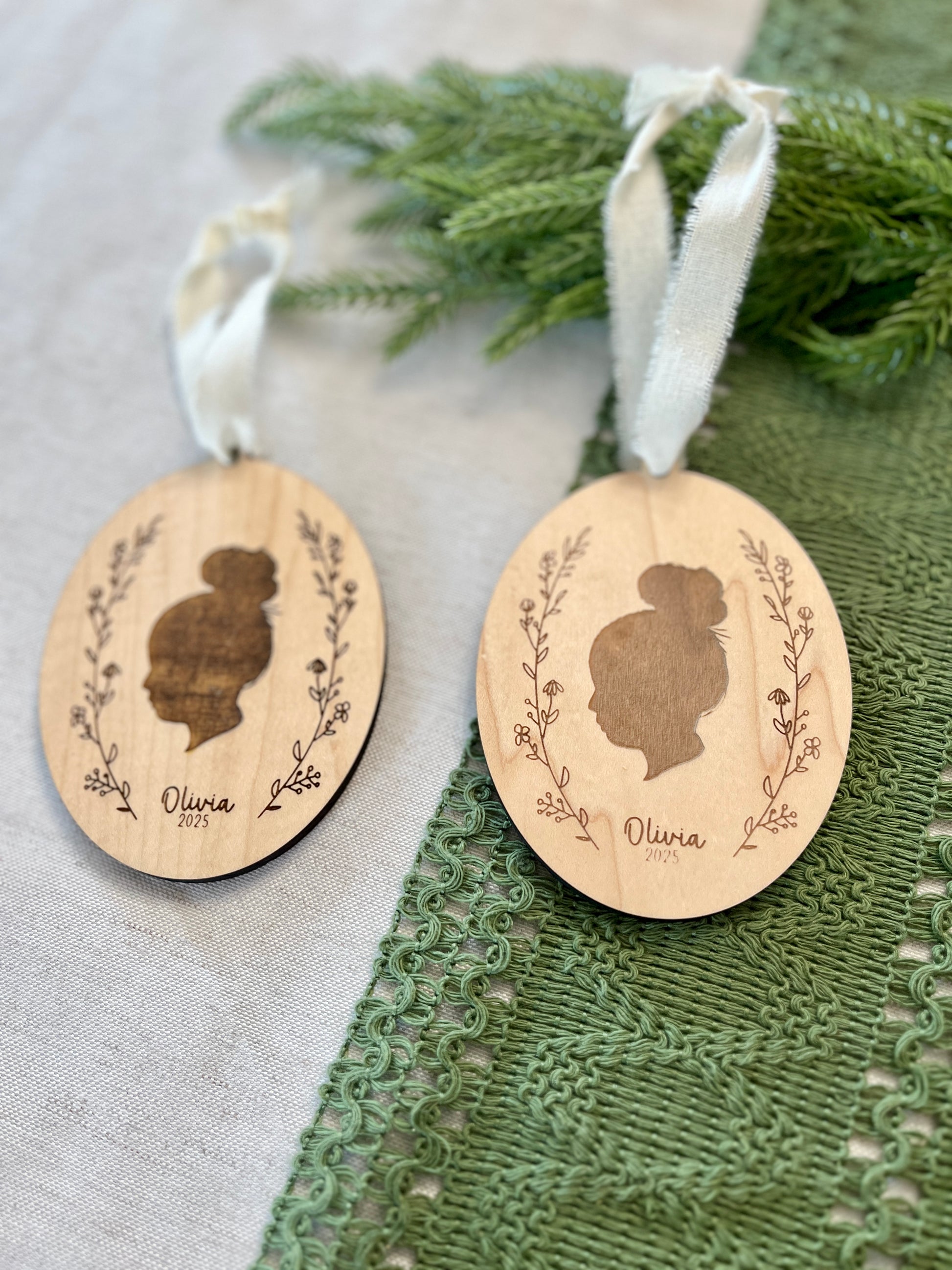 Each ornament begins with a hand drawn side profile illustration, created from a photo you provide. Please respond to your order confirmation with a clear photo (see below). The custom drawing is then engraved onto natural wood, framed with hand drawn delicate botanical details, and finished with your child’s name and year.