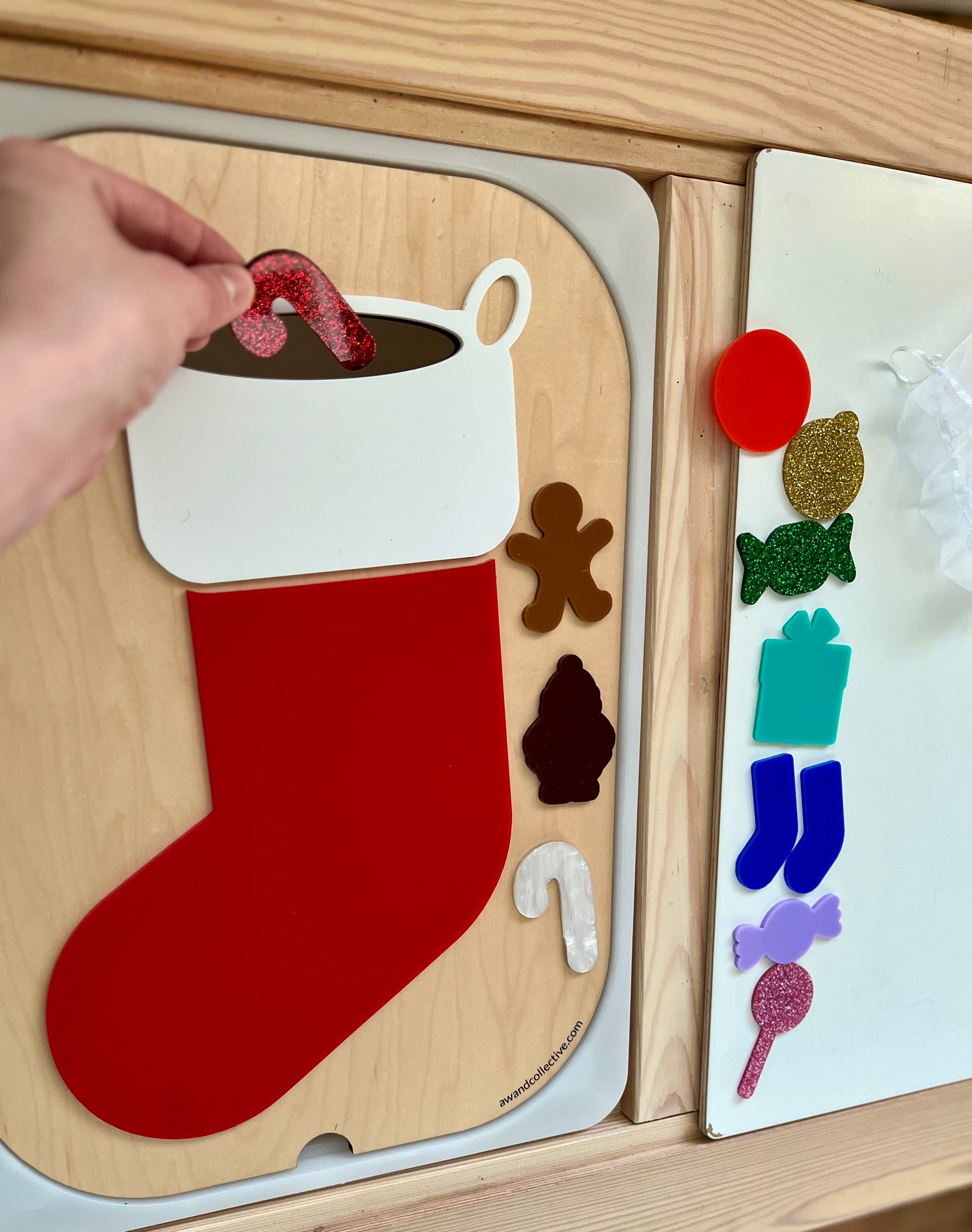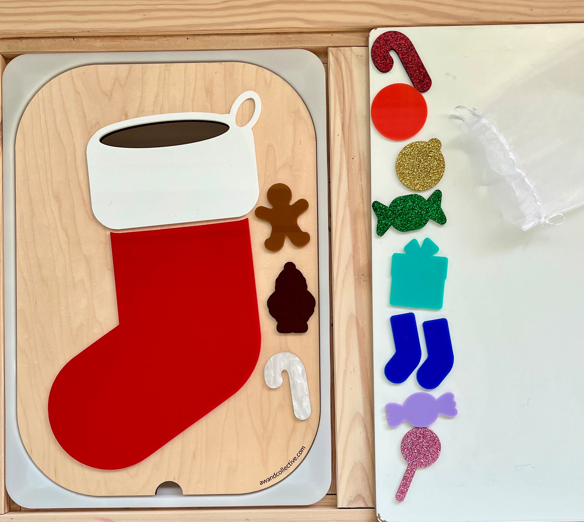 These Flisat inserts/table tops are made to fit the flisat / trofast bins. All acrylic is dry erasable on the glossy side. Stocking stuffers include candy canes, a pair of socks, candies, lollipop present, an orange, a golden ornament/chocolate, a chocolate santa, and a gingerbread cookie.