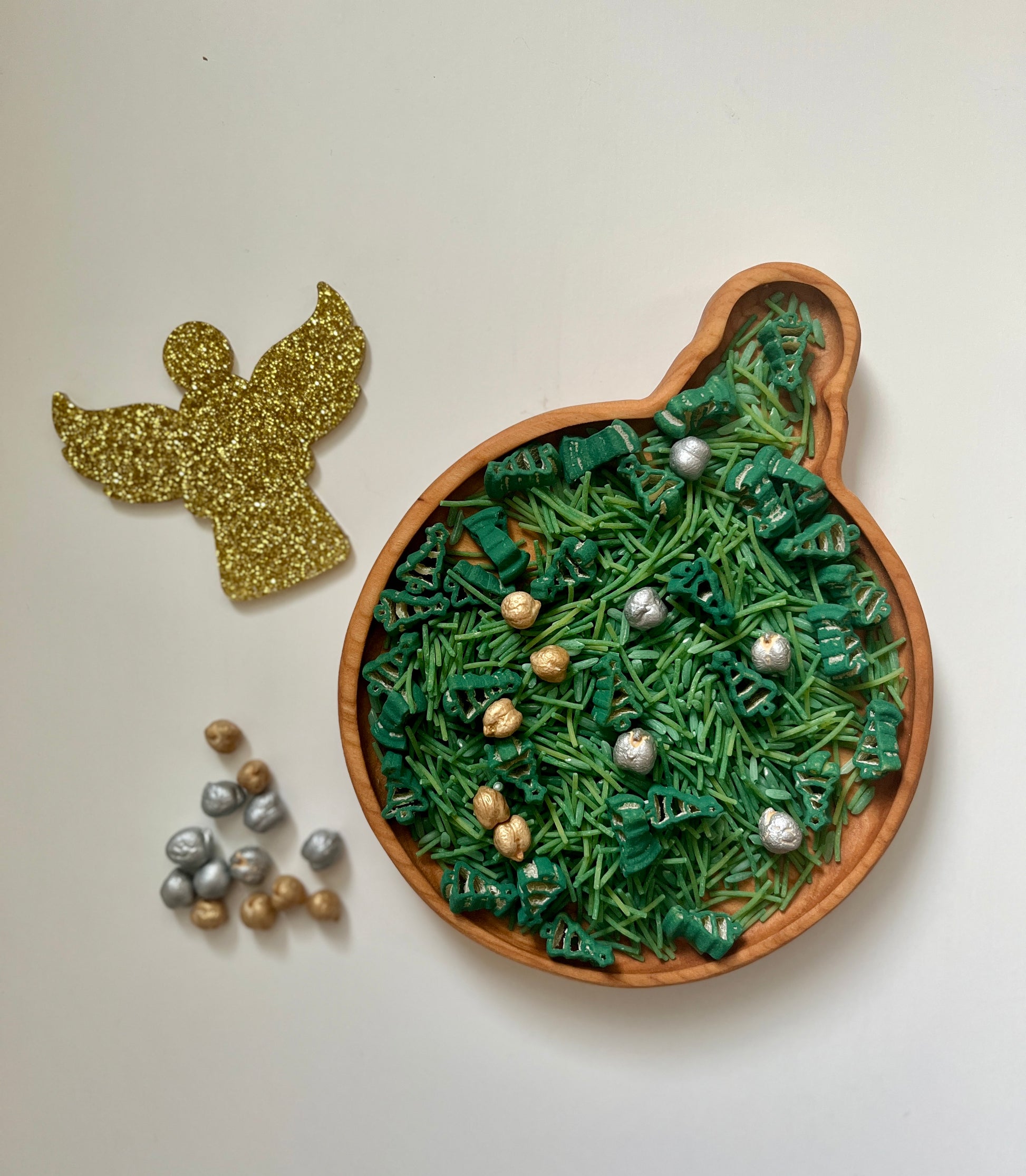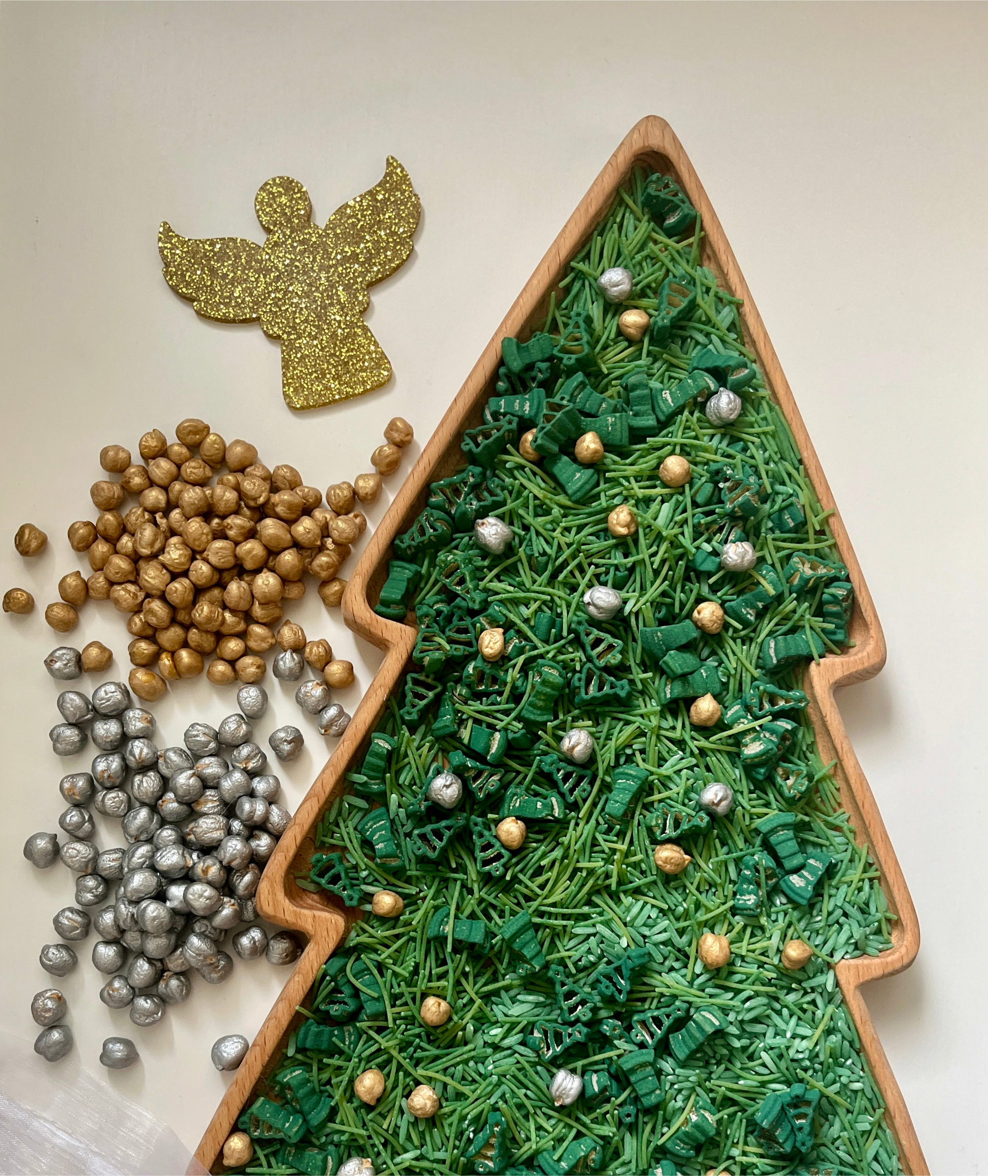 This kit comes with 5 cups total — 4 cups of trees and pine needle combo, and one cup of your choice of colour “Christmas Decorations” (coloured chickpeas) and a glitter gold angel or star.