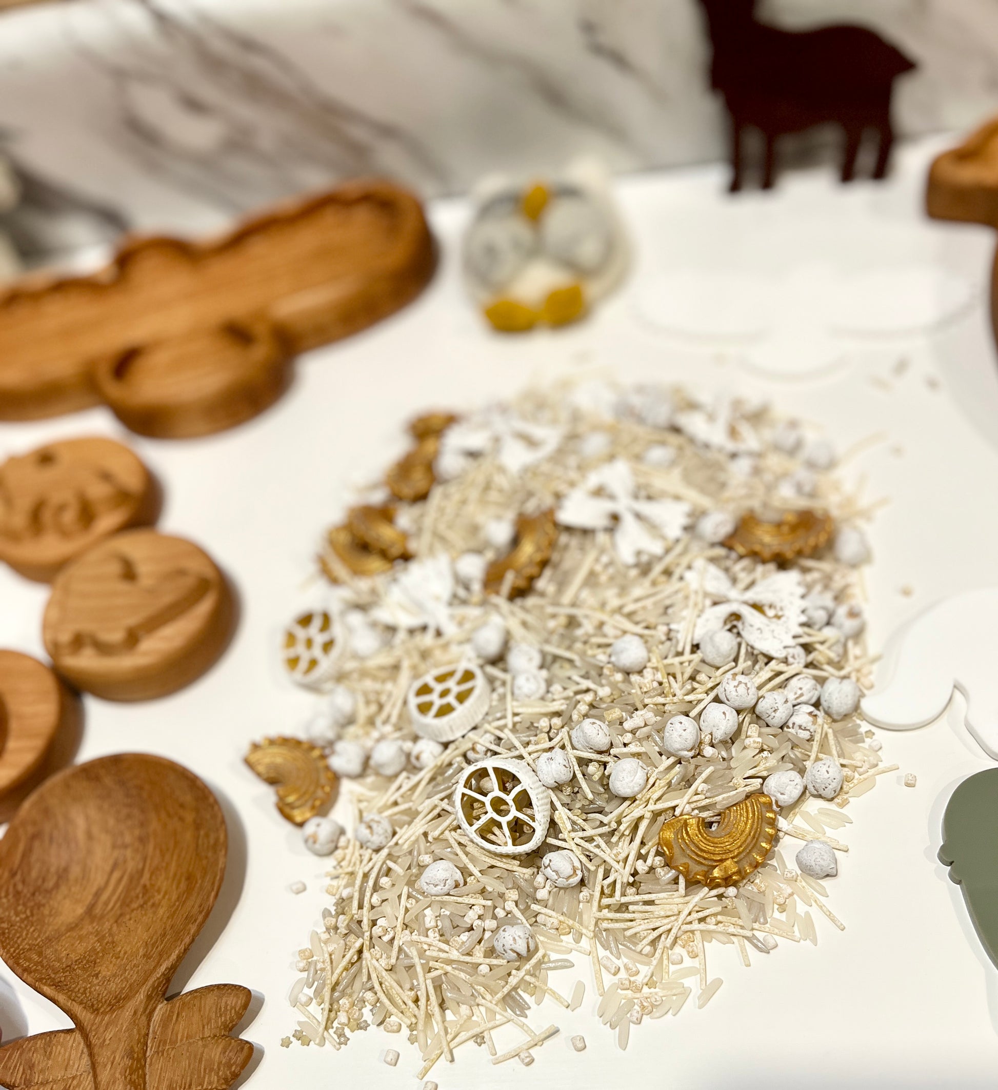 Sensory bin filler — snow !!! 8 different sensory shapes mixed together to create a fun snowy shimmery filler with different textures. Made with chickpeas, rice, and pastas.