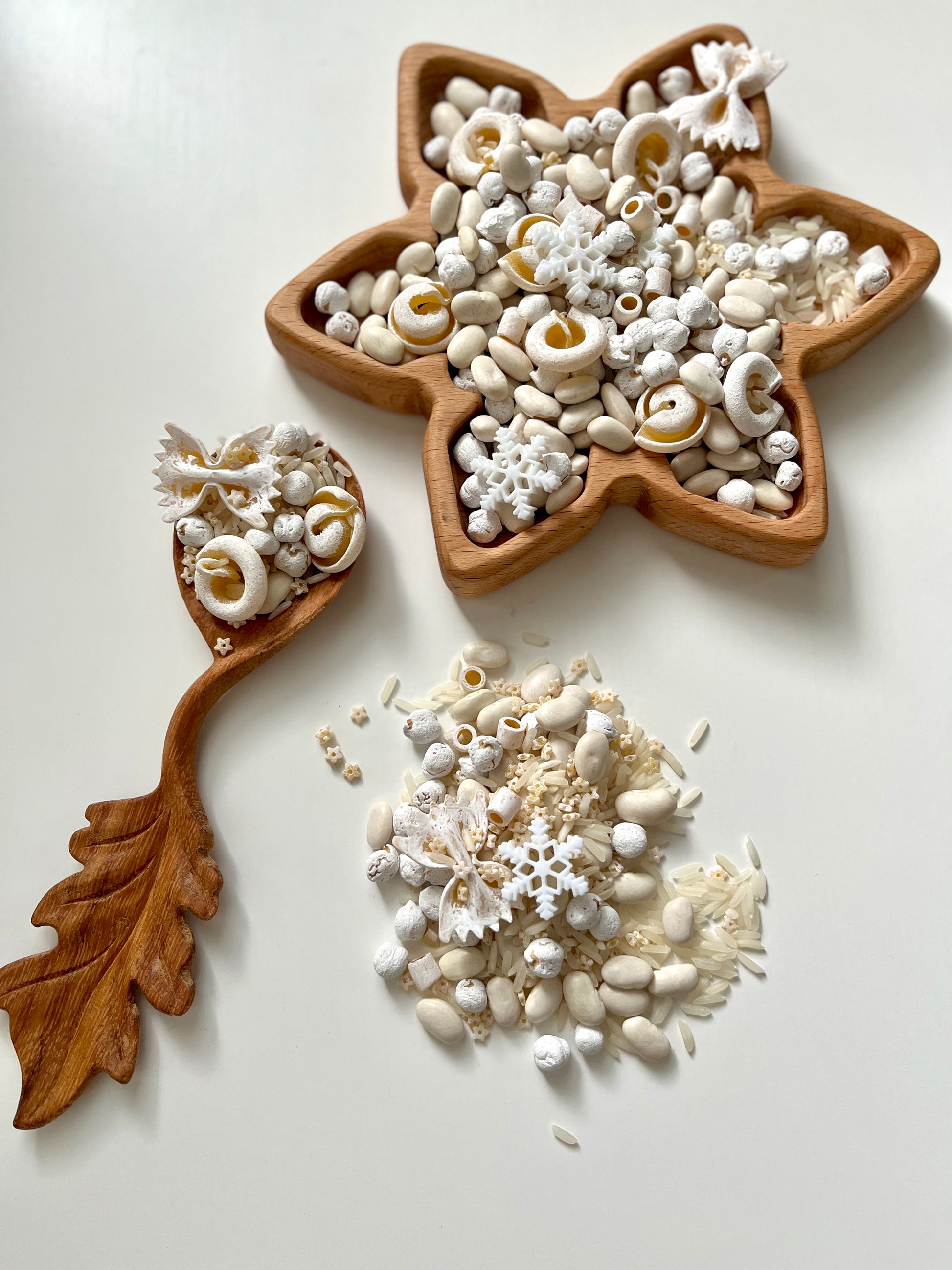 Sensory bin filler — snow !!! 6 different sensory fillers mixed together with glittery resin snowflakes to create a fun snowy filler with different textures. Made with beans, rice, and pastas.