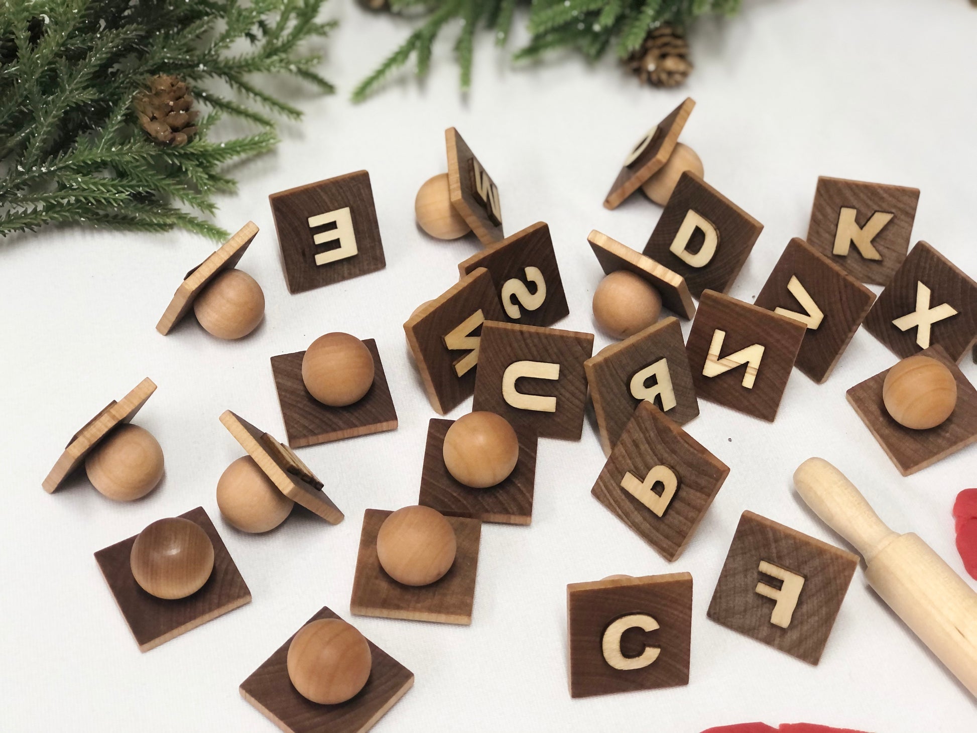 🌈 26 Capital Letter Alphabet Stamps — approx 1.5” in size. The knobs are comfortable to push with little palms.