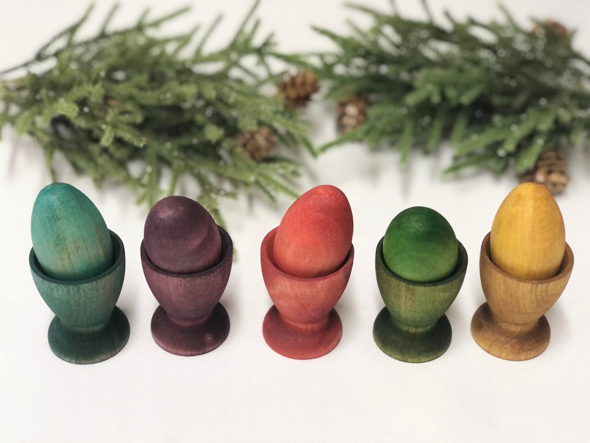 These are the perfect little cups and eggs for color sorting. Pair them with other toys in our hand dyed line up to practice color sorting; or find items around the house that match the cups — the possibilities are endless. The eggs fit perfectly inside of these cups.