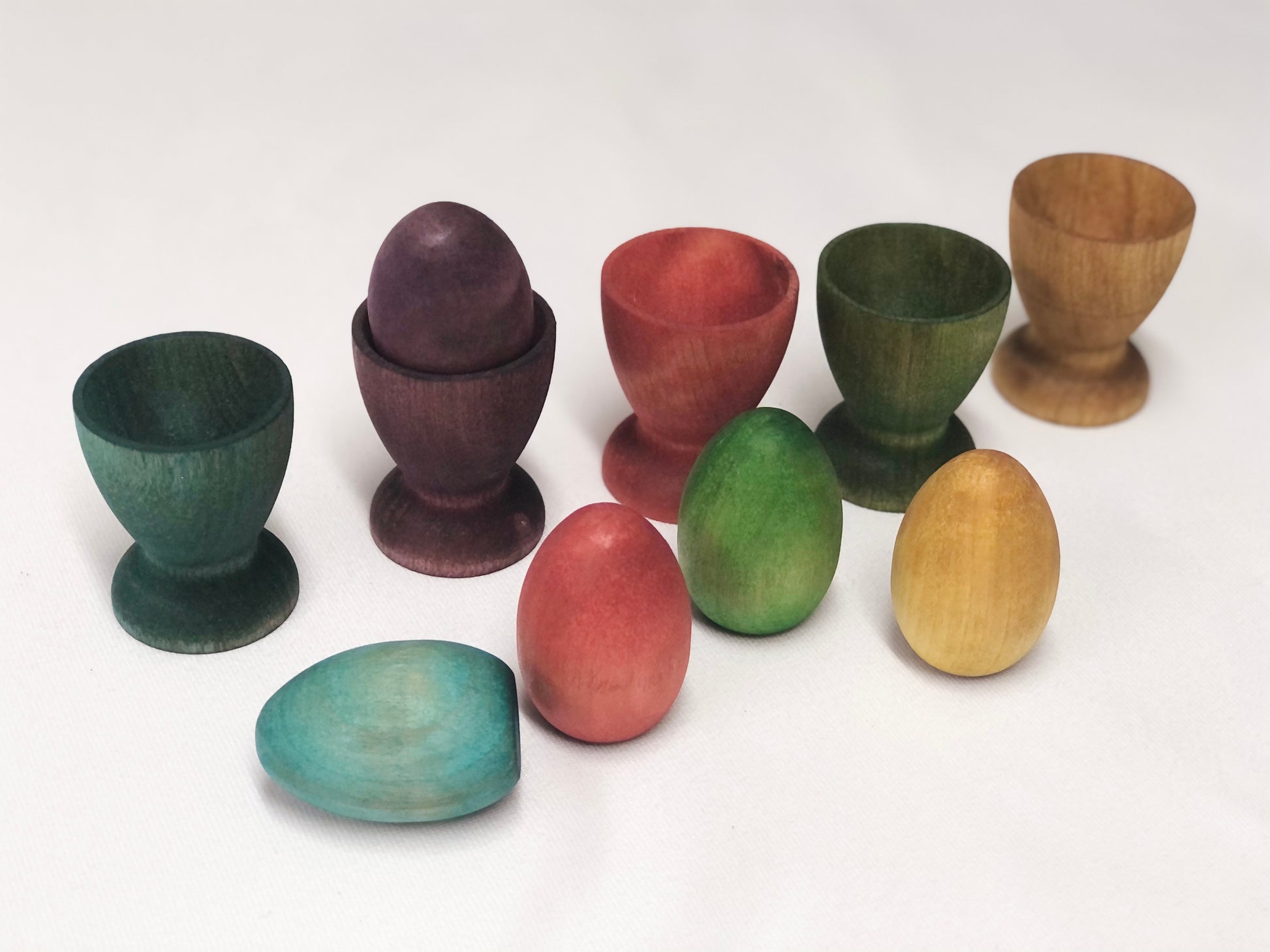 The cups and eggs are pleasing to touch; as well as look beautiful on a shelf. These cups are hand stained with food safe colour. It is truly non toxic for your little ones. You can still see the wood grain. Each piece of wood absorbs the stain in its own way making it truly unique and beautiful. They are sealed with a water based clear coat but colour transfer may eventually occur due to it being a watercolour dye.