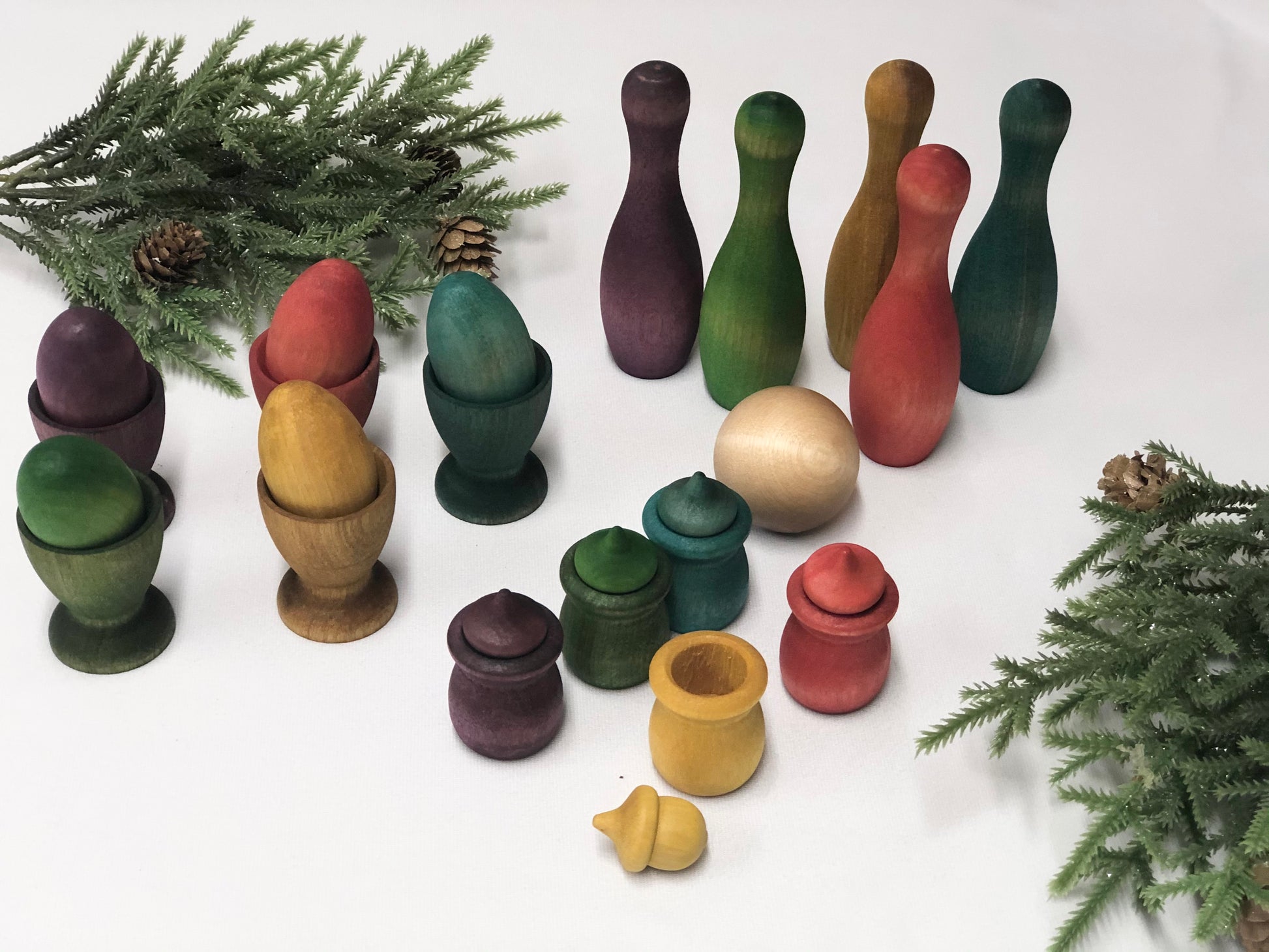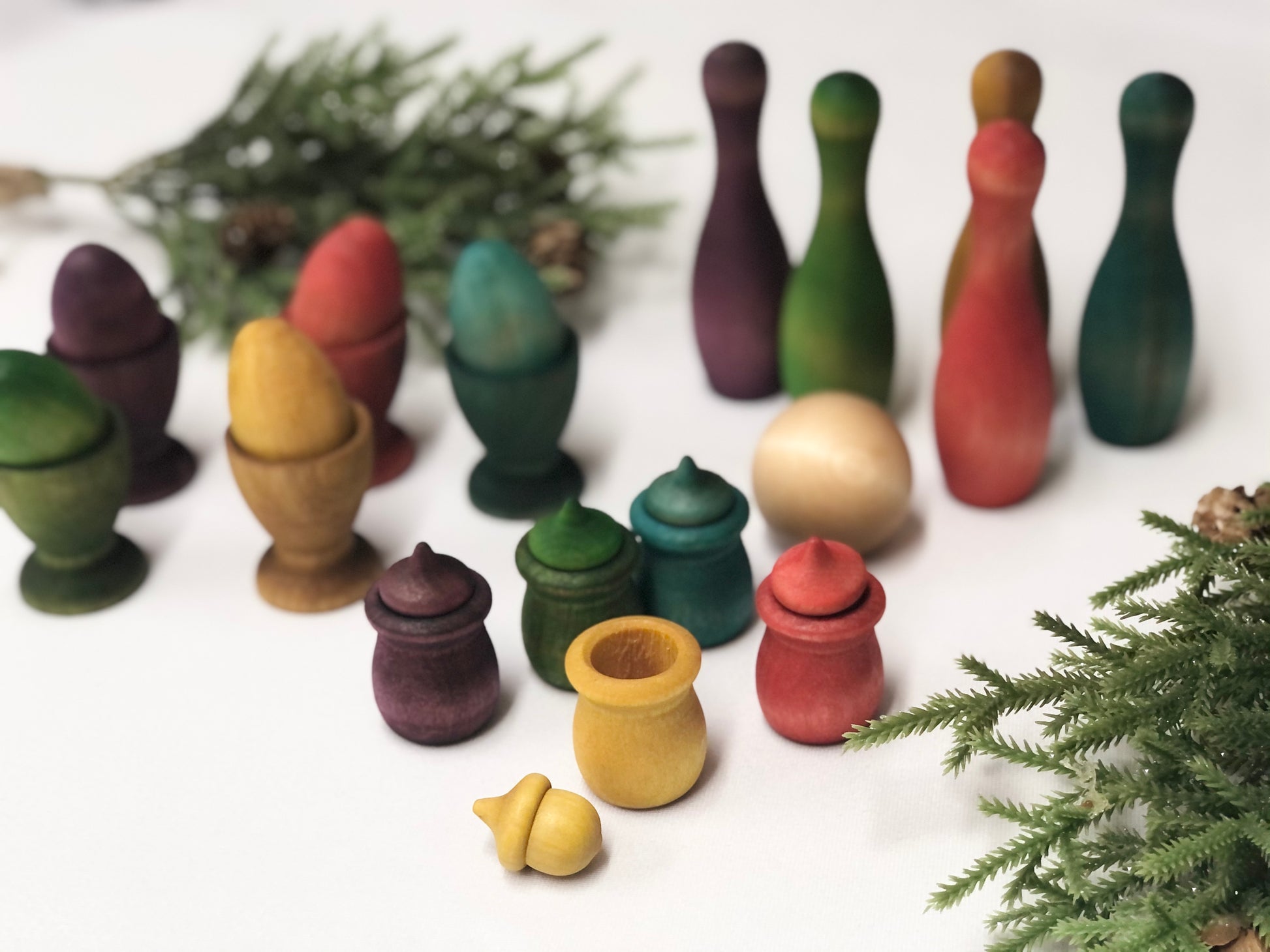 Help your little one learn colors while practicing fine motor skills and sharpening color recognition. Your little one will love playing with these colored cups. Stack up all the cups!! This is a waldorf learning toy that can also be used for practicing their counting skills. Count the cups!!! Count the eggs!! This set pairs beautifully with other toys in our lineup. This set is good for colour sorting, shape identification, pincer grasp, counting, stacking, hand-eye coordination — the list goes on. Plus it is great for imaginary play. My daughter likes sorting the colours, and playing with them with her play food. She plays with them in her “kitchen”. Open ended play is also encouraged — use the cups to pretend play in the kitchen — measuring out spices & ingredients and stirring in the cups — or using the eggs in a stew.