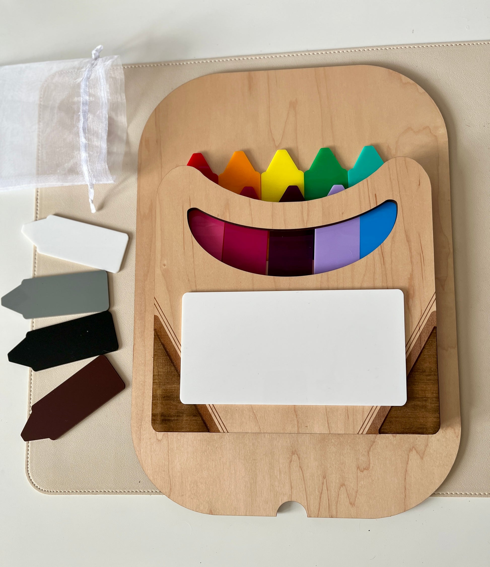 3. Spelling and Vocabulary — Each crayon can have a letter, word, or picture associated with it. Kids can use the crayons to spell out words, match pictures to words, or even practice rhyming and building simple sentences. Use the white piece on the board and write a category, and have them match up the letter/word/picture associated on the crayon.