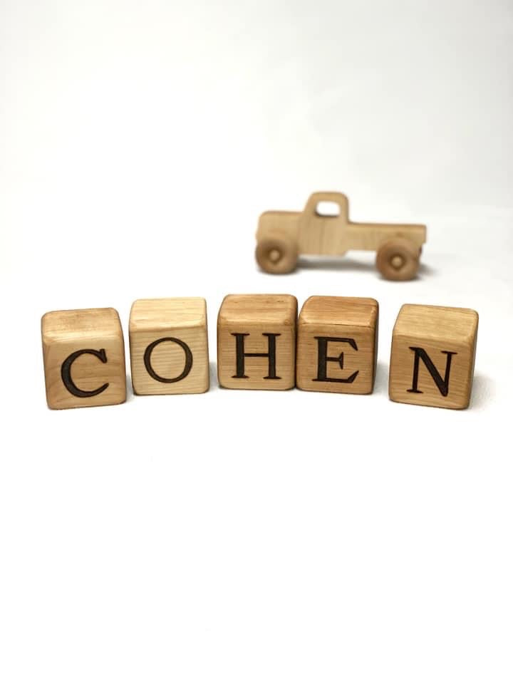 Our blocks are a little larger than a lot that are available on the market. Each block is 2 inches square. They are sanded by hand to smooth out the edges, and each letter is hand drawn and hand burned onto the wood block. I do not use any stencils or stamps in my process. The burning tool and wood blocks are completely non toxic, and are finished with an FDA approved, certified Kosher Natural Non-Toxic Wood Oil.