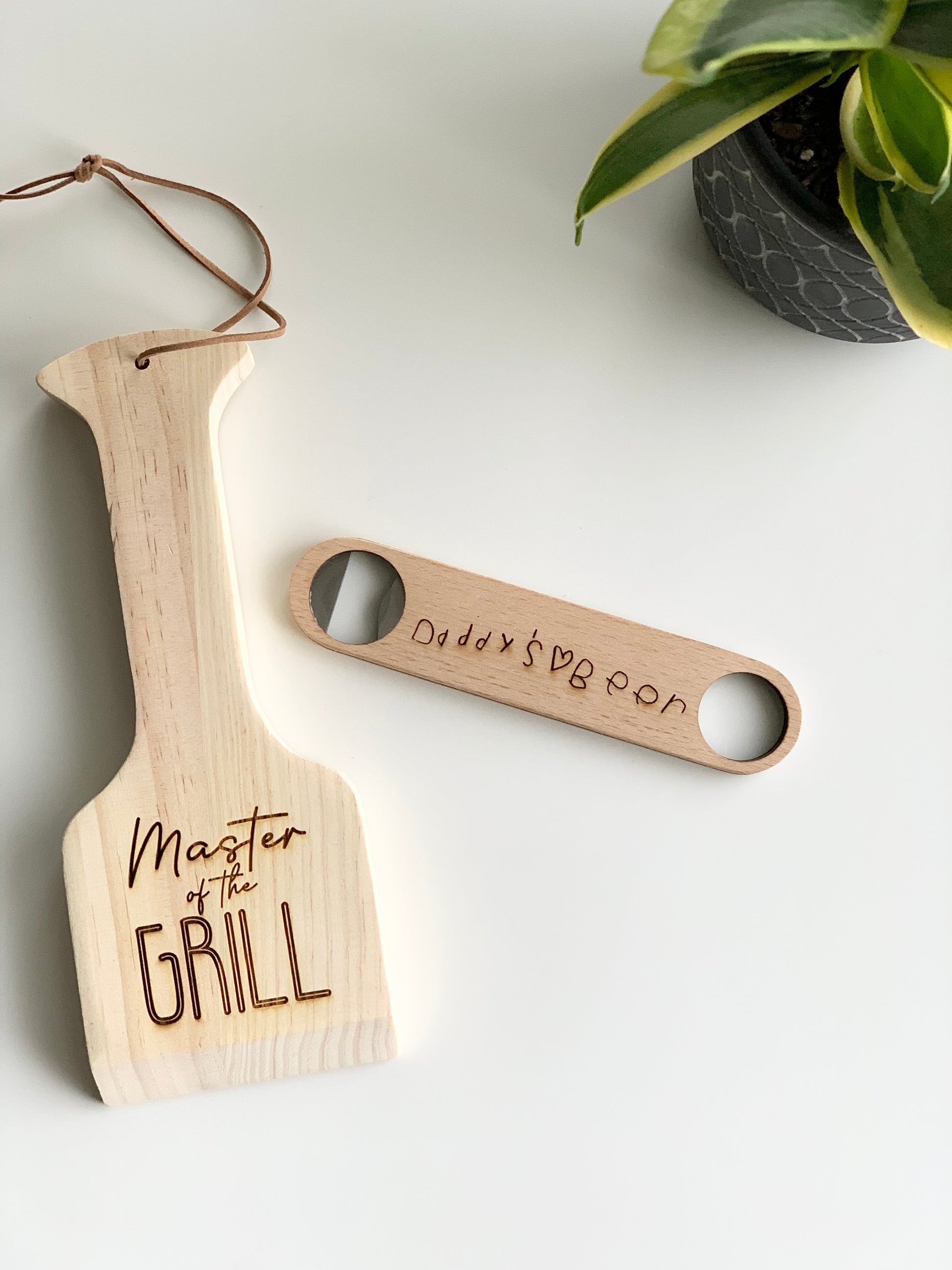 Want to use your or your kiddo’s writing on your bbq scraper? Choose the “Handwritten” option and then reply to your confirmation email with a bright, white picture of the handwriting in mind.