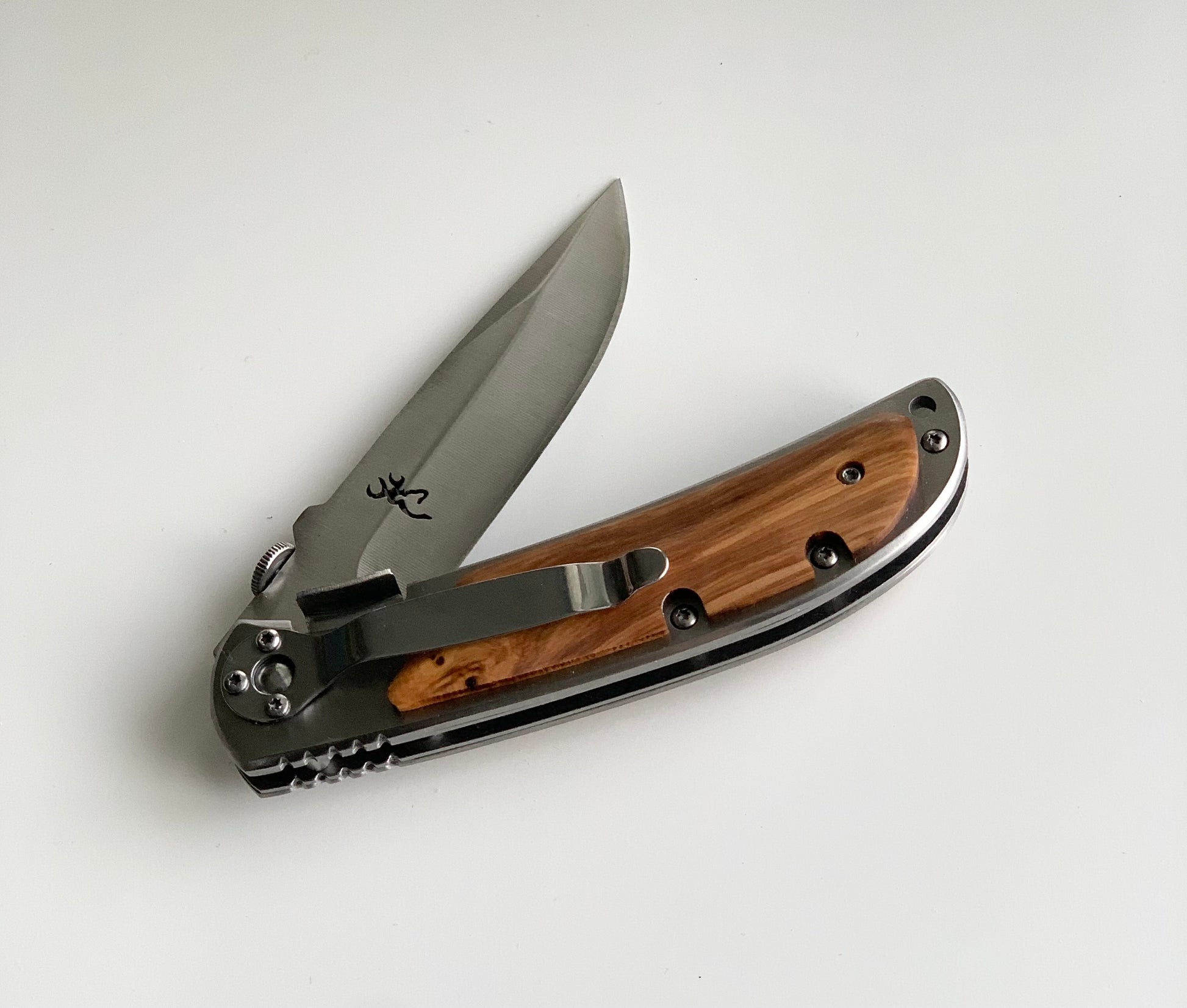 High Quality, tactical pocket knife. It has a good weight to it, a sharp blade, and a highly reliable but easy to use folding mechanism. It is a 3.25” stainless steel locking blade. The pocket knife itself is 4.5” long (when closed). Both sides have wood overlay but opposite side has belt clip for easy access.