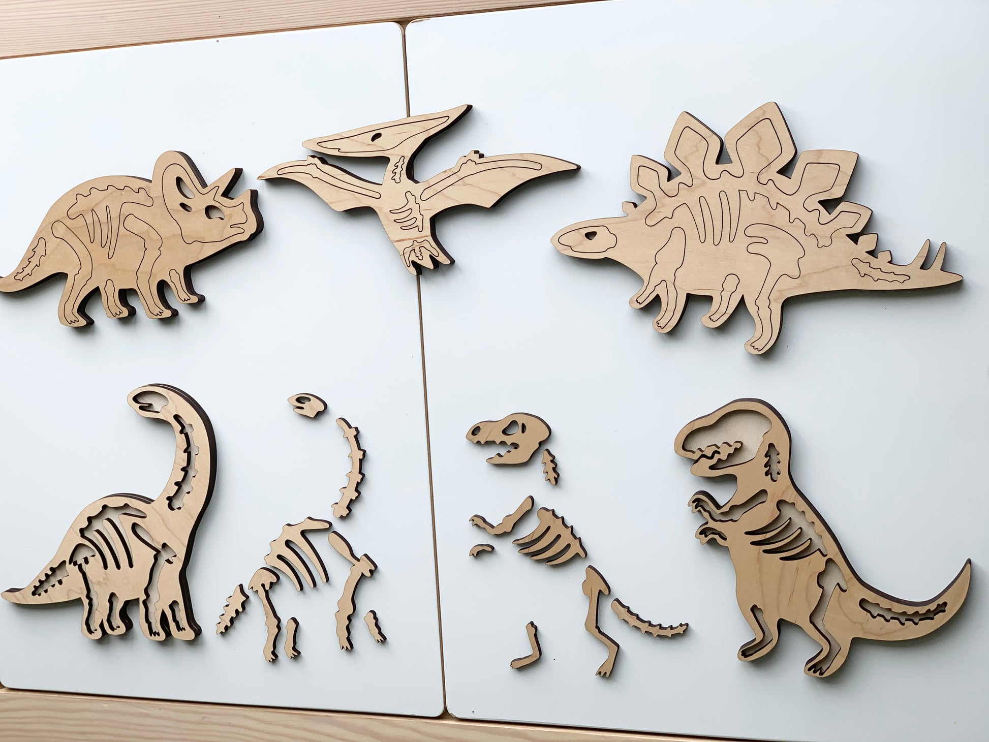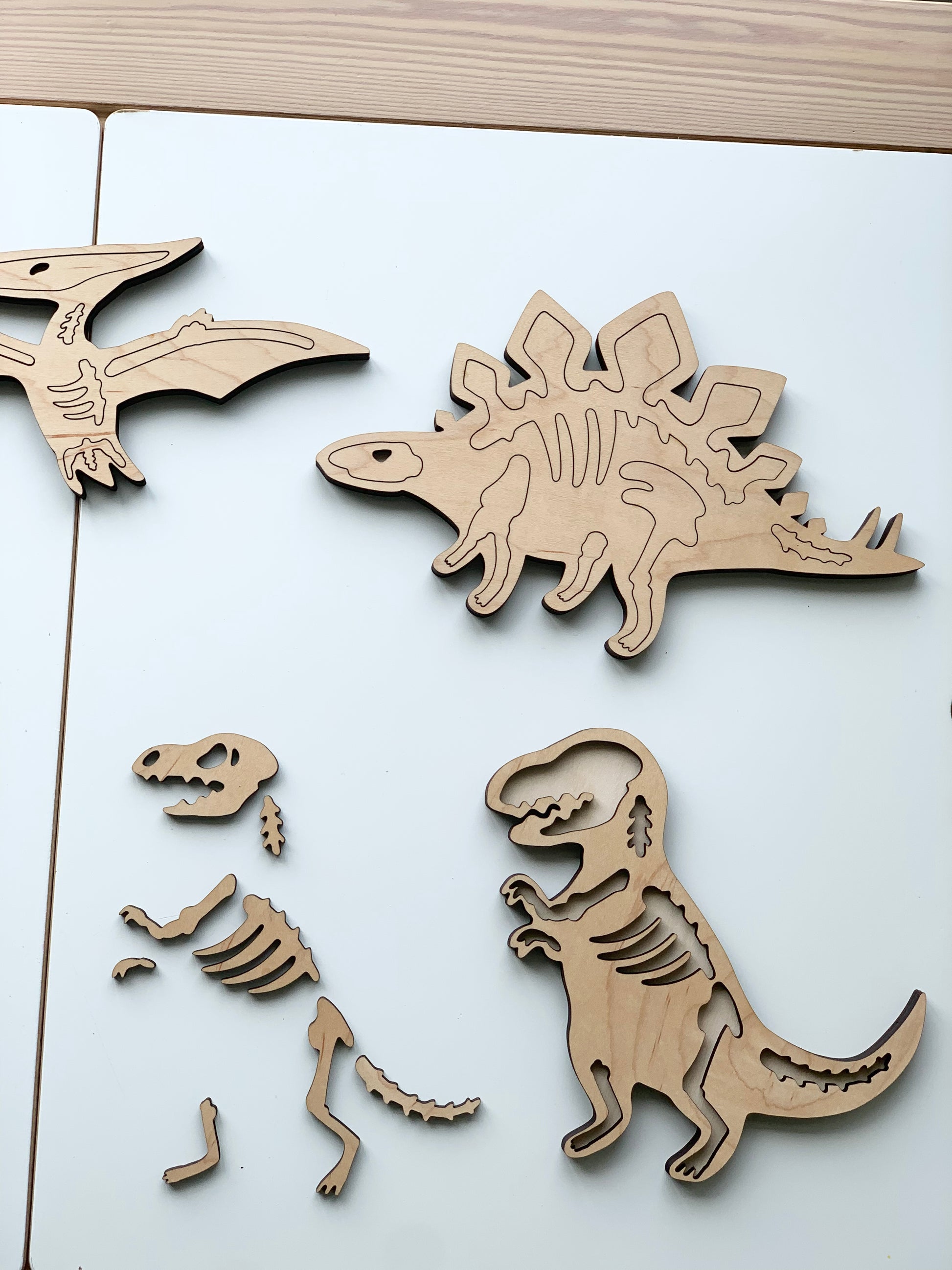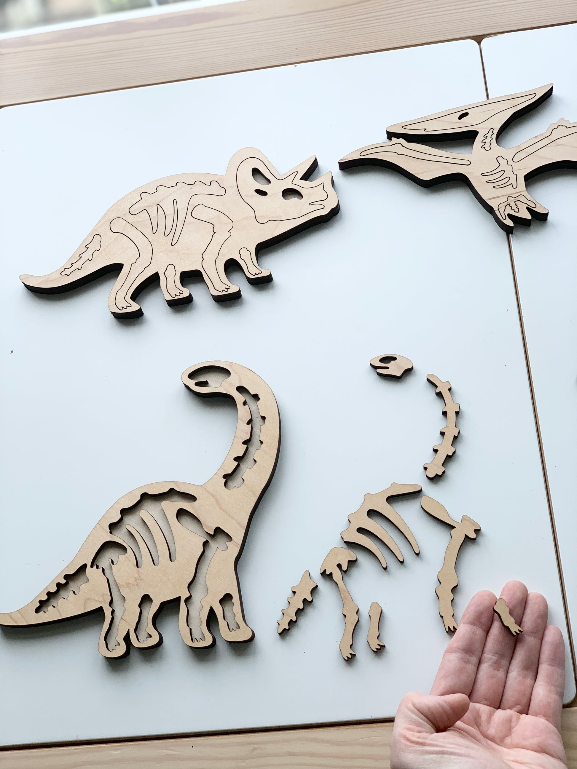 Dinosaur Bone Puzzles! Use them for regular puzzles, dino digs, in your dinosaur play set ups - the options are endless. Hide the bones in some sensory sand, and have your kiddos dig them out with tweezers or other sensory tools. Looking for something a little more tricky for your older kiddo? Dump the bones from all 5 dinosaurs in at once and challenge them to see how fast they can do it. Due to some of the bones being small in size, this is definitely meant for older kiddos who are no longer mouthing their toys.