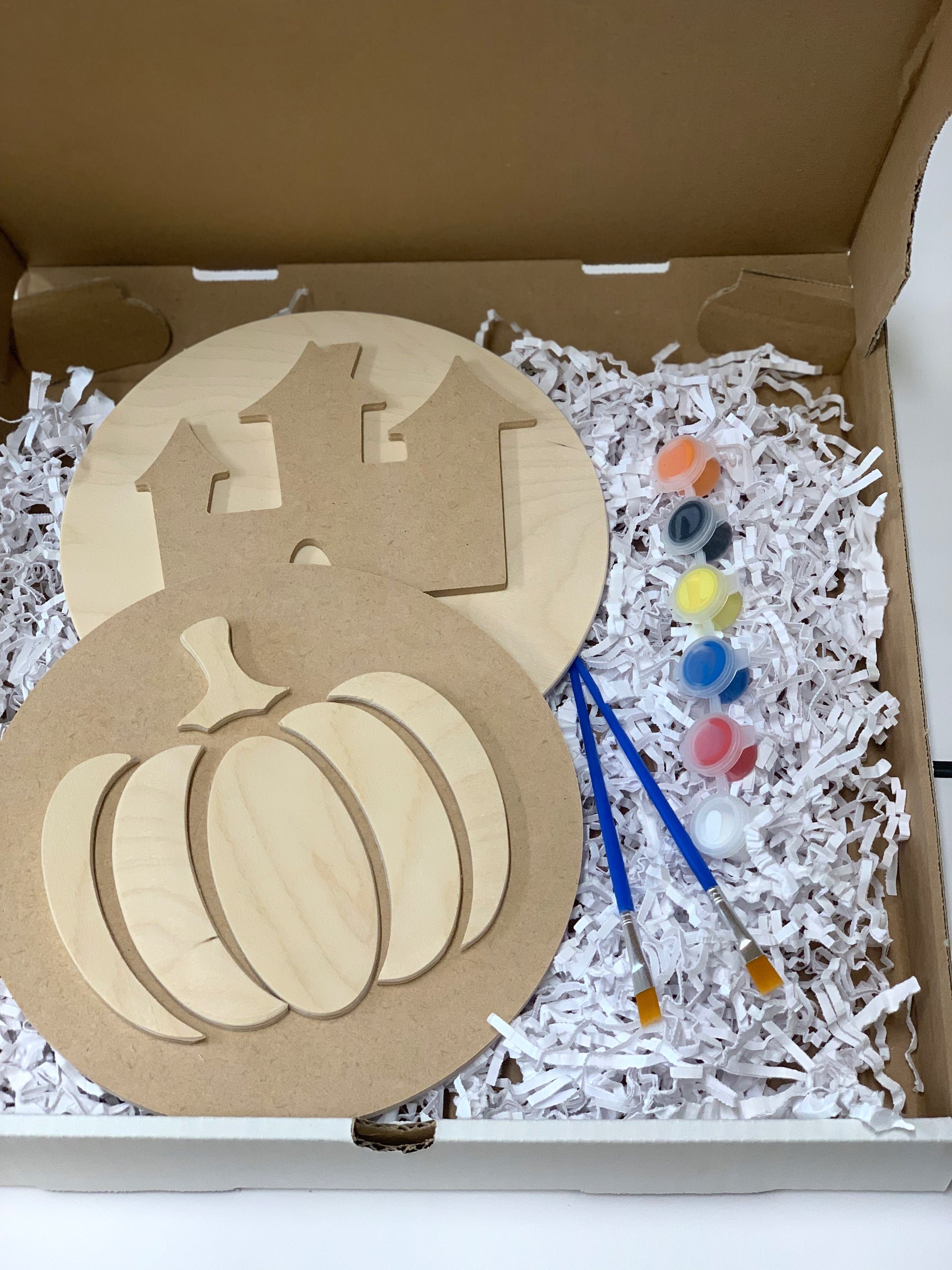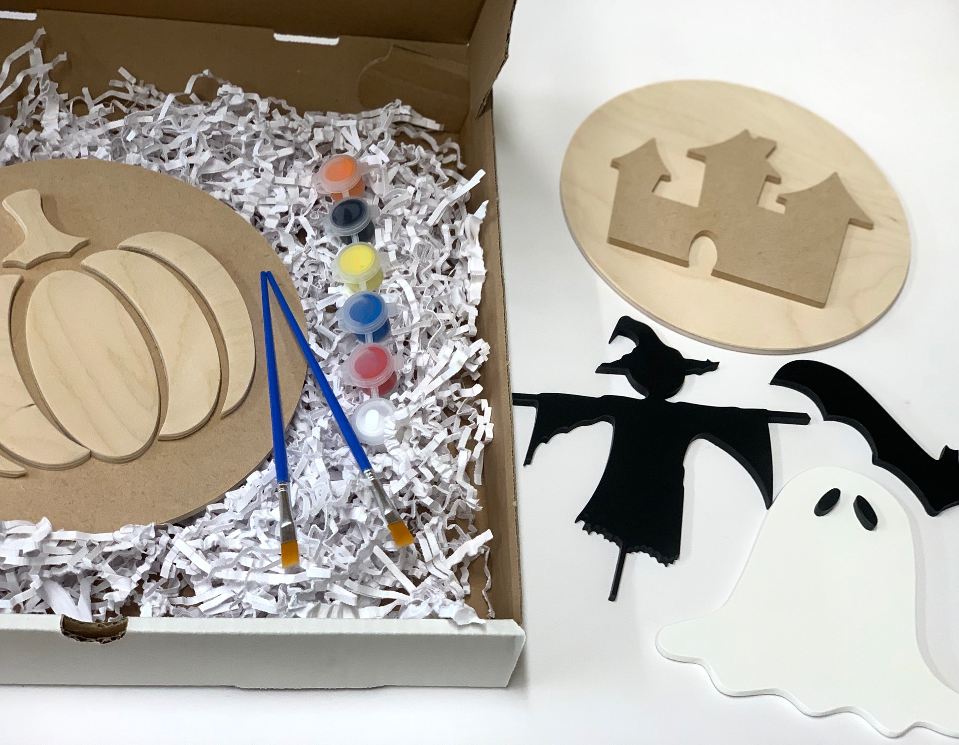 - One or Two unfinished decorative elements - pumpkin, haunted house, bat, ghost, or scarecrow. Please feel free to request specific items in the notes otherwise these will be chosen for you. The notes box can be found at the bottom of your screen when you are in your cart/viewing your cart.