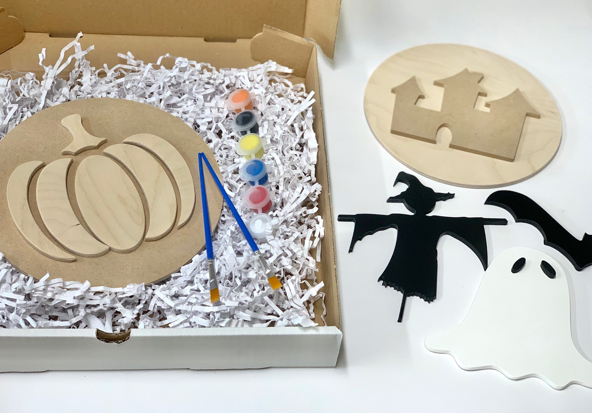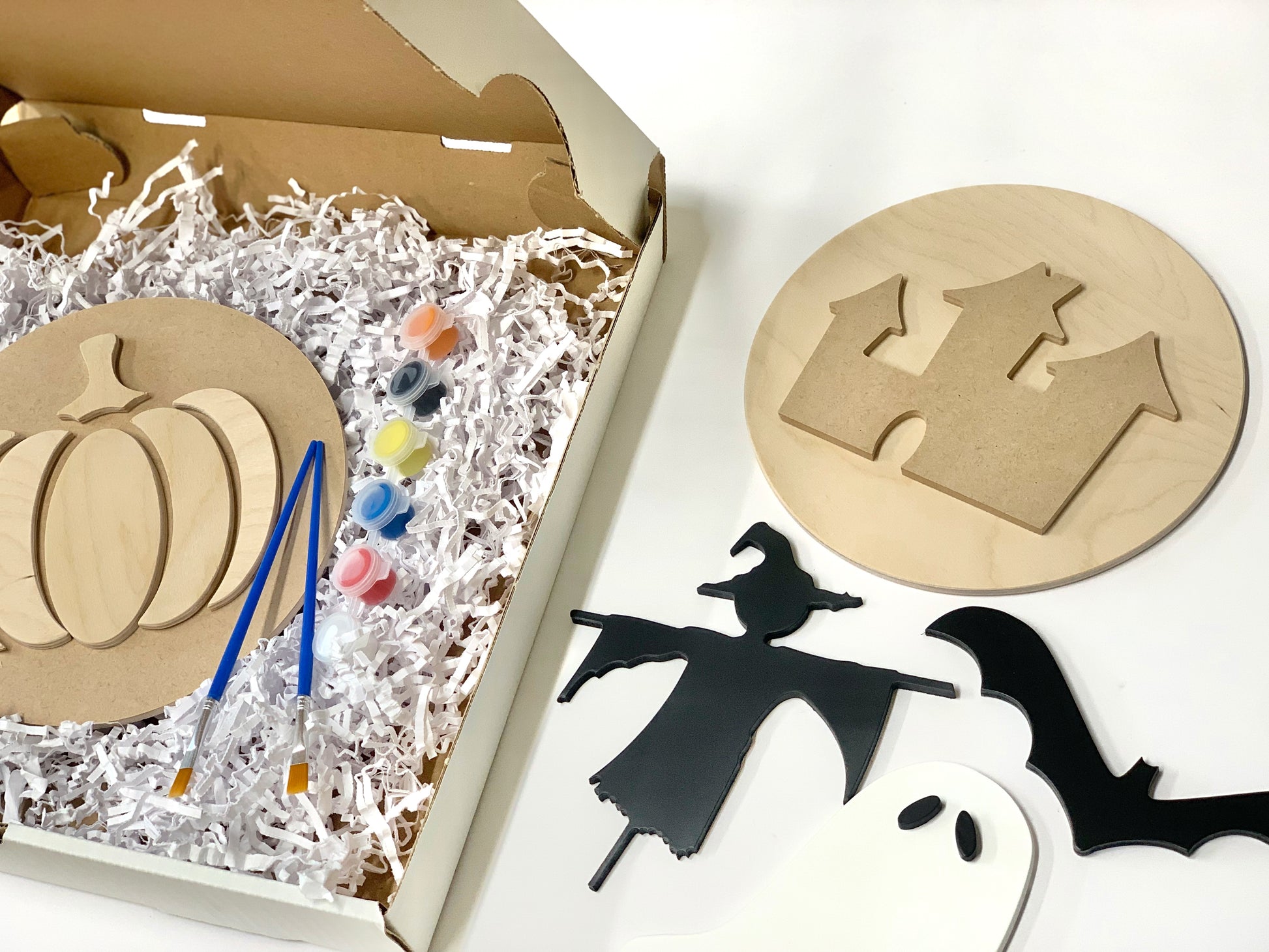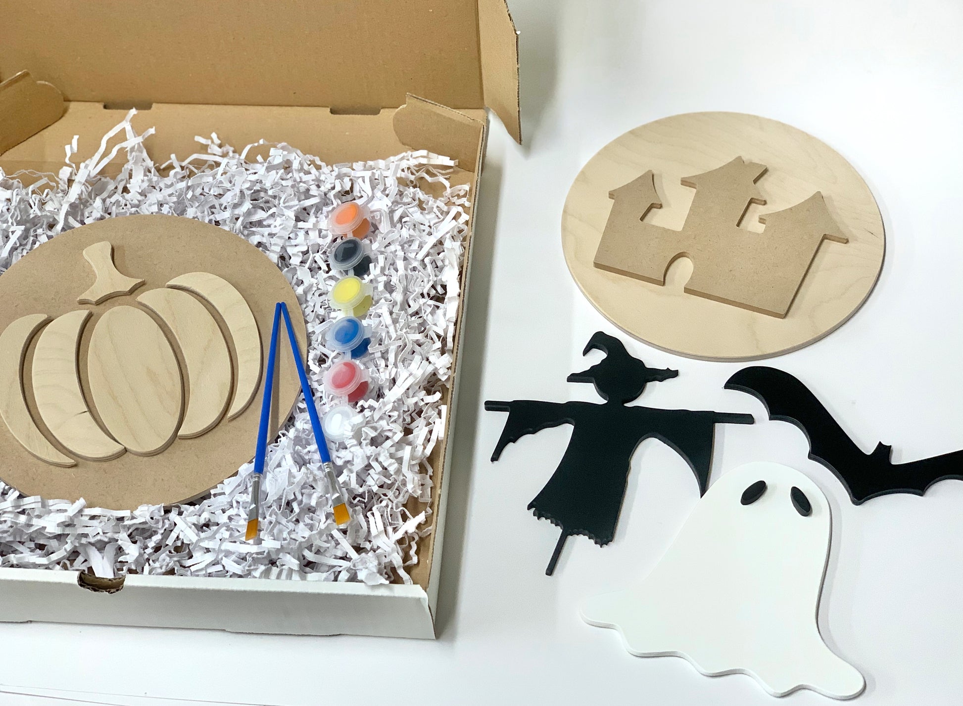 Feeling crafty? Grab one of these DIY Halloween kits and get painting! This is a super fun Halloween craft for all ages. Time to get spooky! All pieces come unfinished/raw in colour - but sanded and ready for painting. Please note that some of the samples in the photos are painted but your kit will all be unpainted.