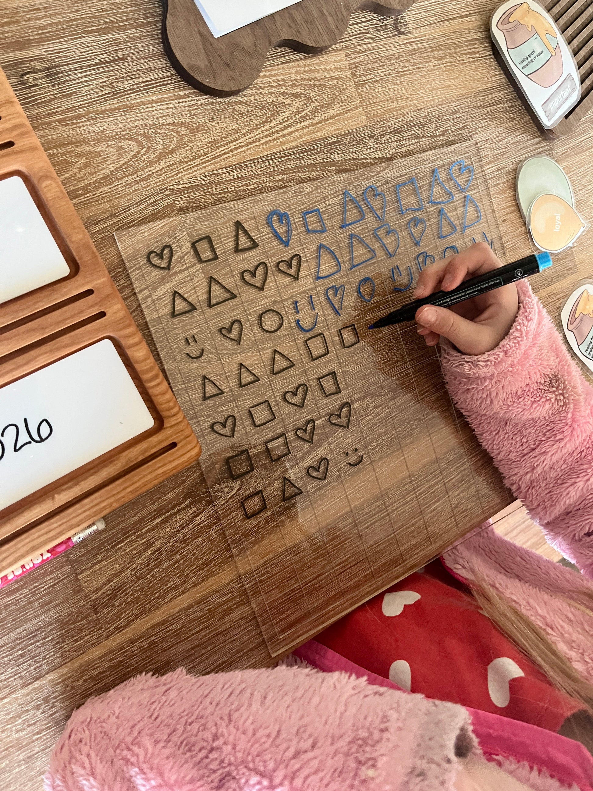 The transparent design allows it to be layered over different backgrounds or learning materials, encouraging creativity and exploration while keeping the focus on the child’s thinking process.