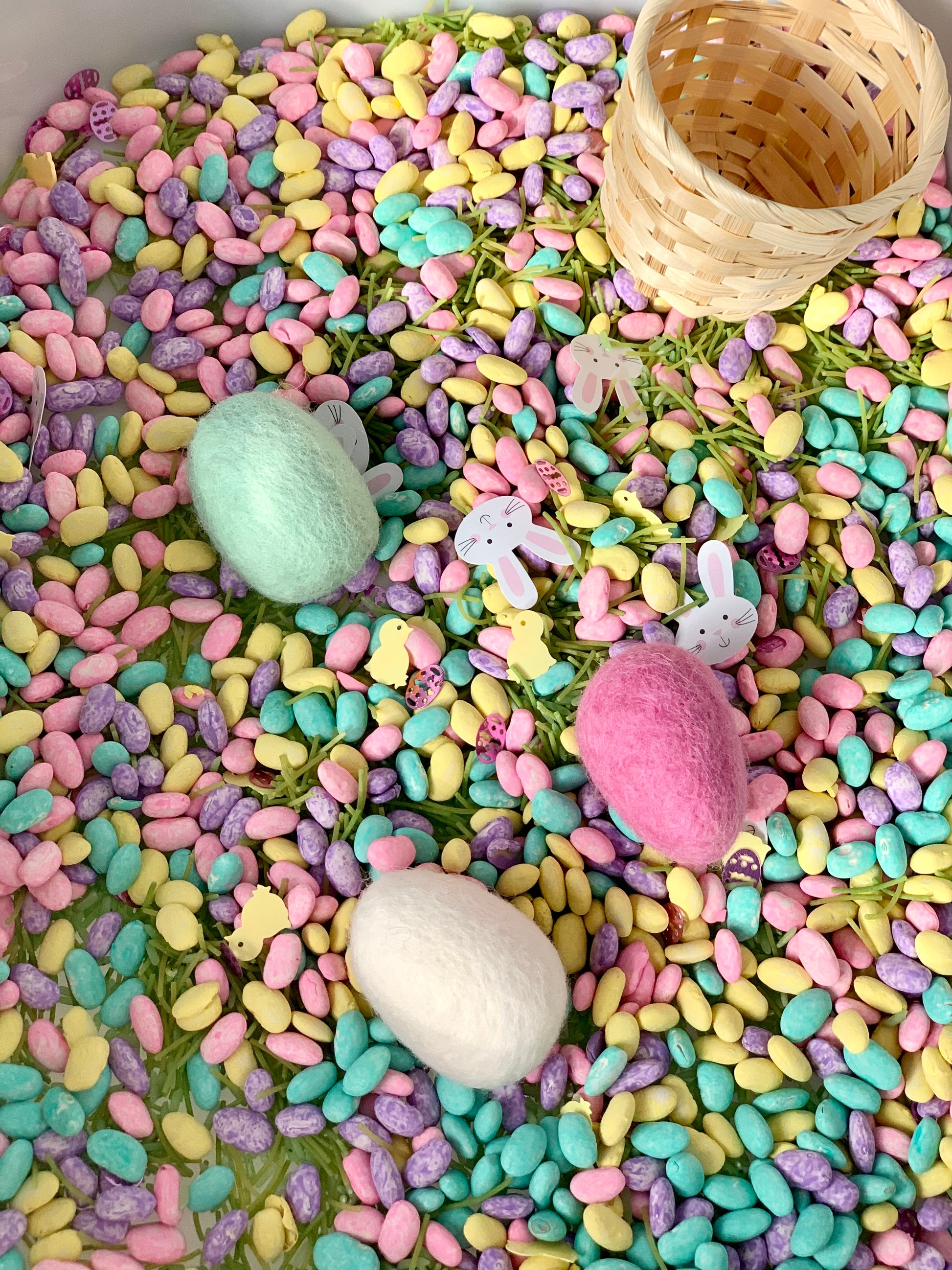 Each Kit comes with 5 1/2 cups of filler, some Easter confetti, and an optional mini basket, and three felt eggs.