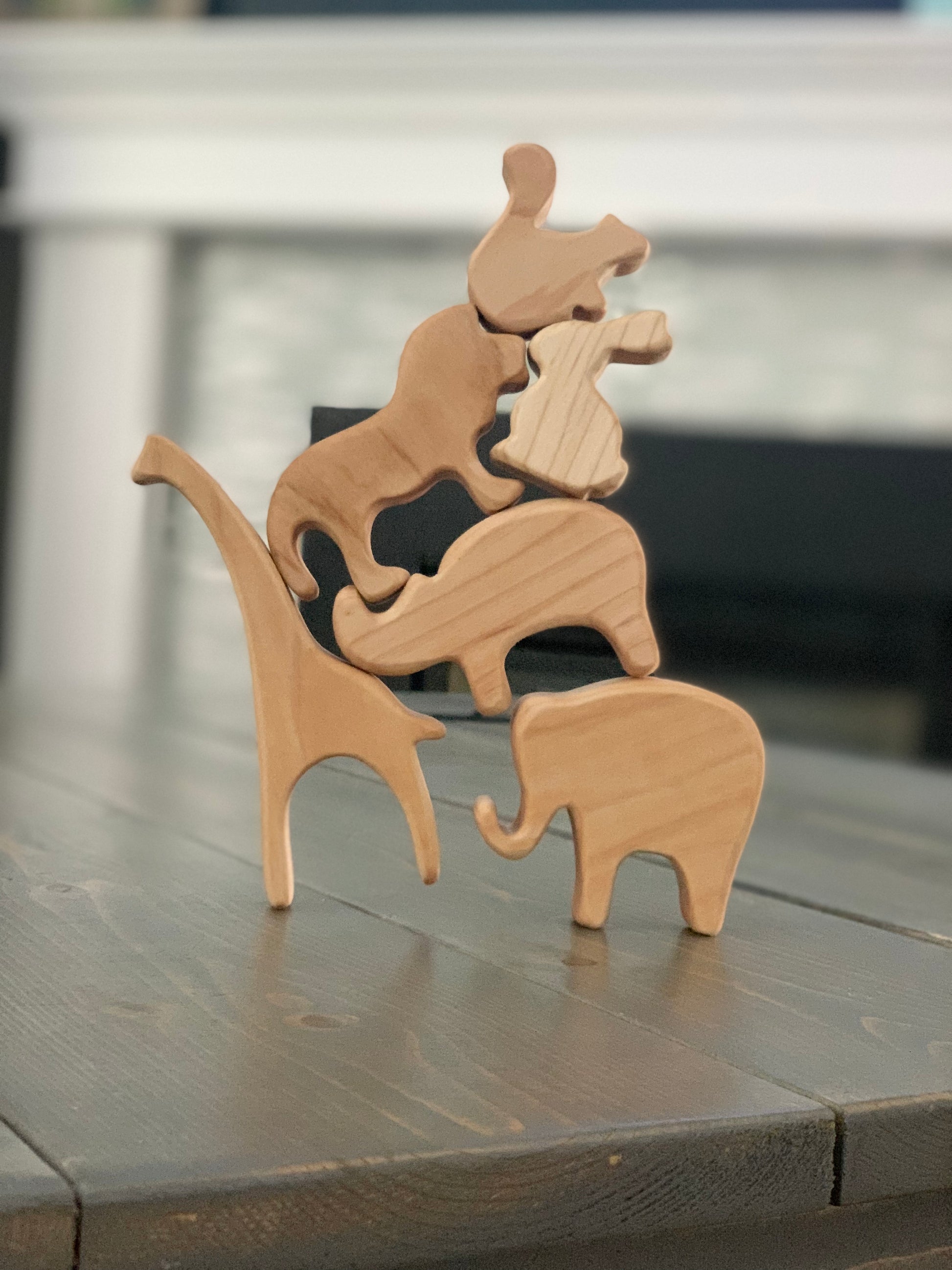 Each animal is cut in house, meticulously sanded smooth in every corner, nook and cranny; and finished with love. These heirloom quality toys are made to be passed down for generations. These are eco-friendly, safe, natural and long-lasting. Choose from beautiful light hardwood (maple) or rich dark hardwood (walnut).