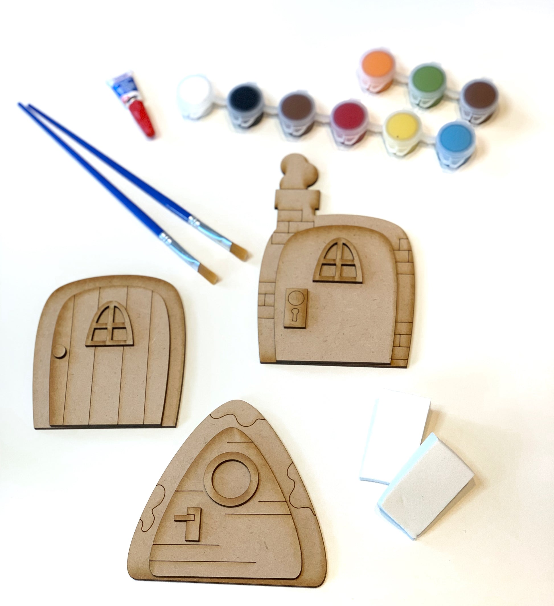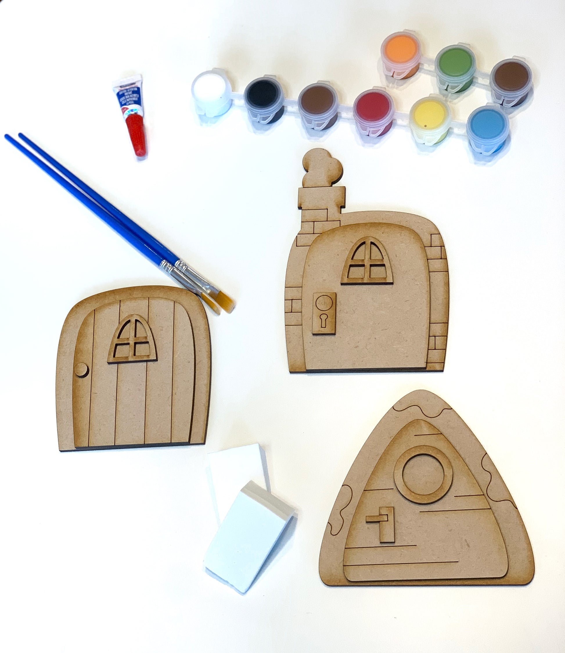 Made from sustainability sourced 1/8” MDF. Each door has 3 layers with a backer piece, a door, and a doorknob & window. Each kit comes with your choice of paint pod options, super glue, 2 paintbrushes and 2 foam makeup brushes. The foam brushes work very well for painting larger surfaces with ease. The MDF is a very smooth surface that is easy to paint.