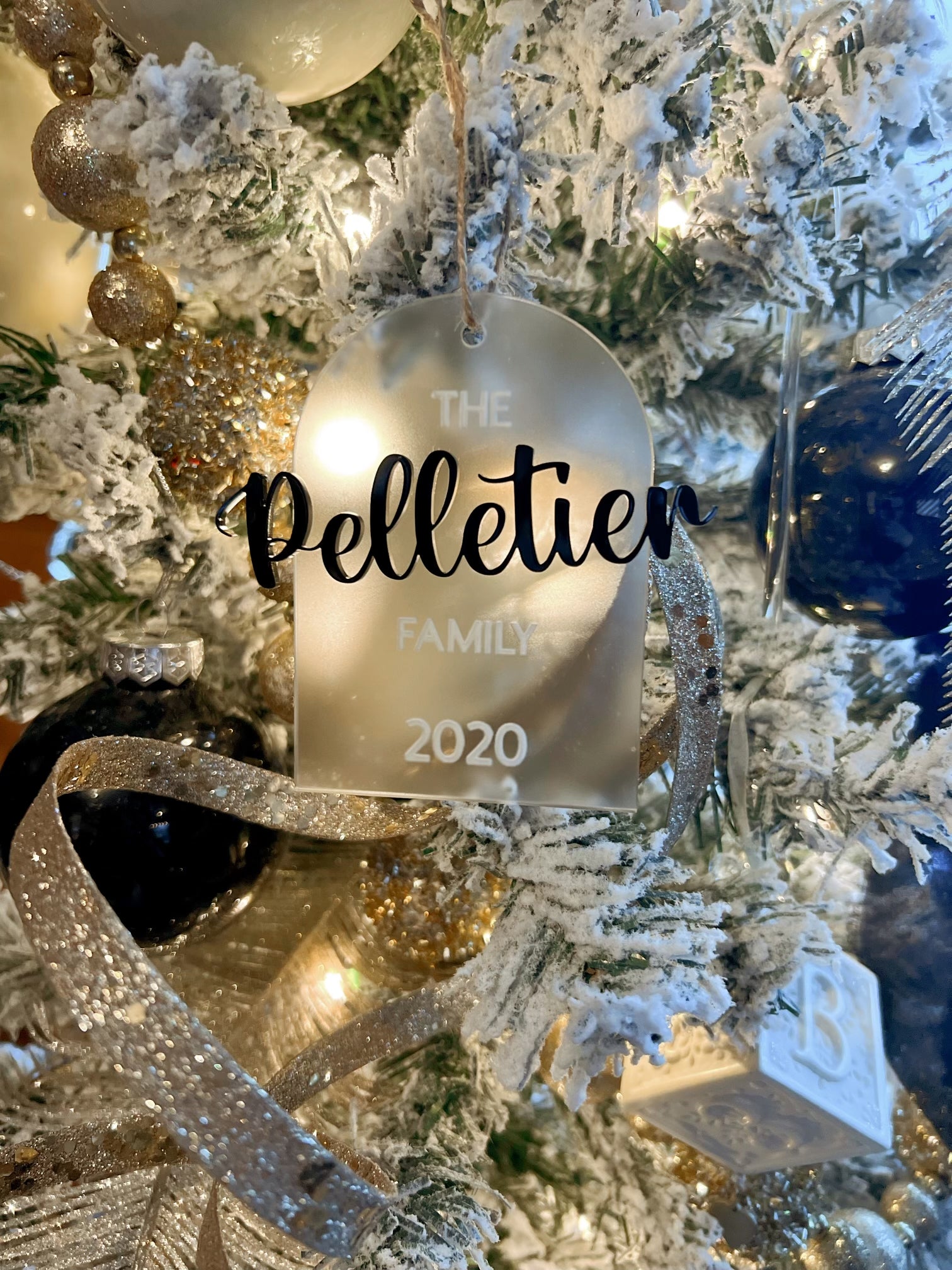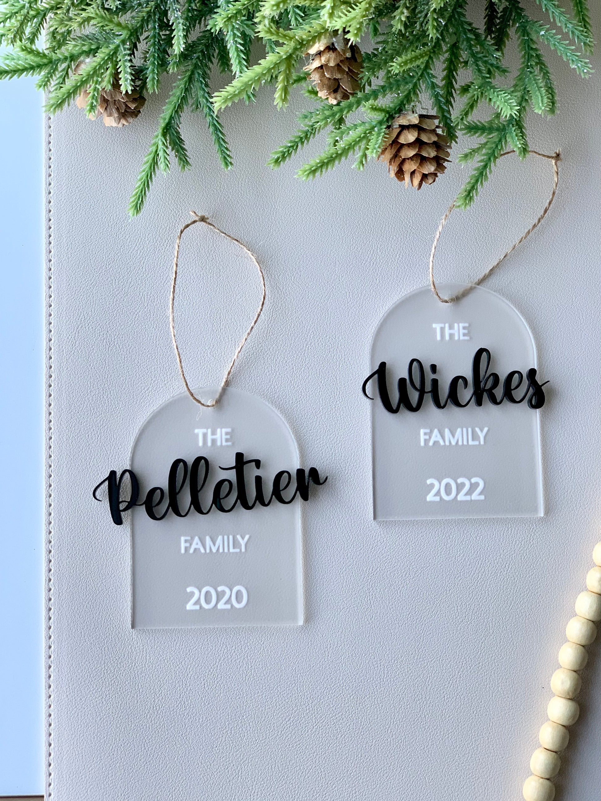 Each ornament is from 3mm frosted acrylic and engraved. Name on front is 3mm acrylic.