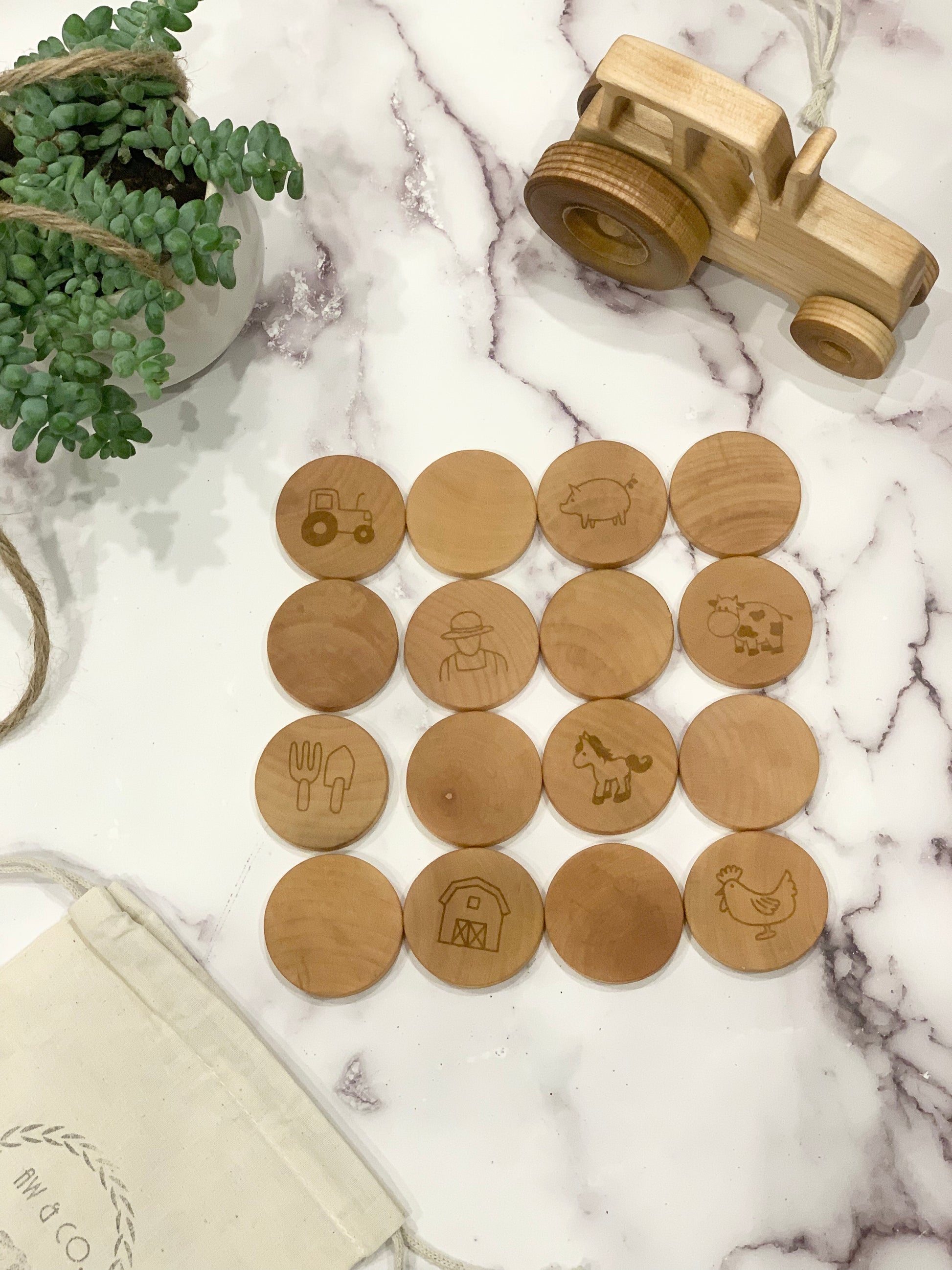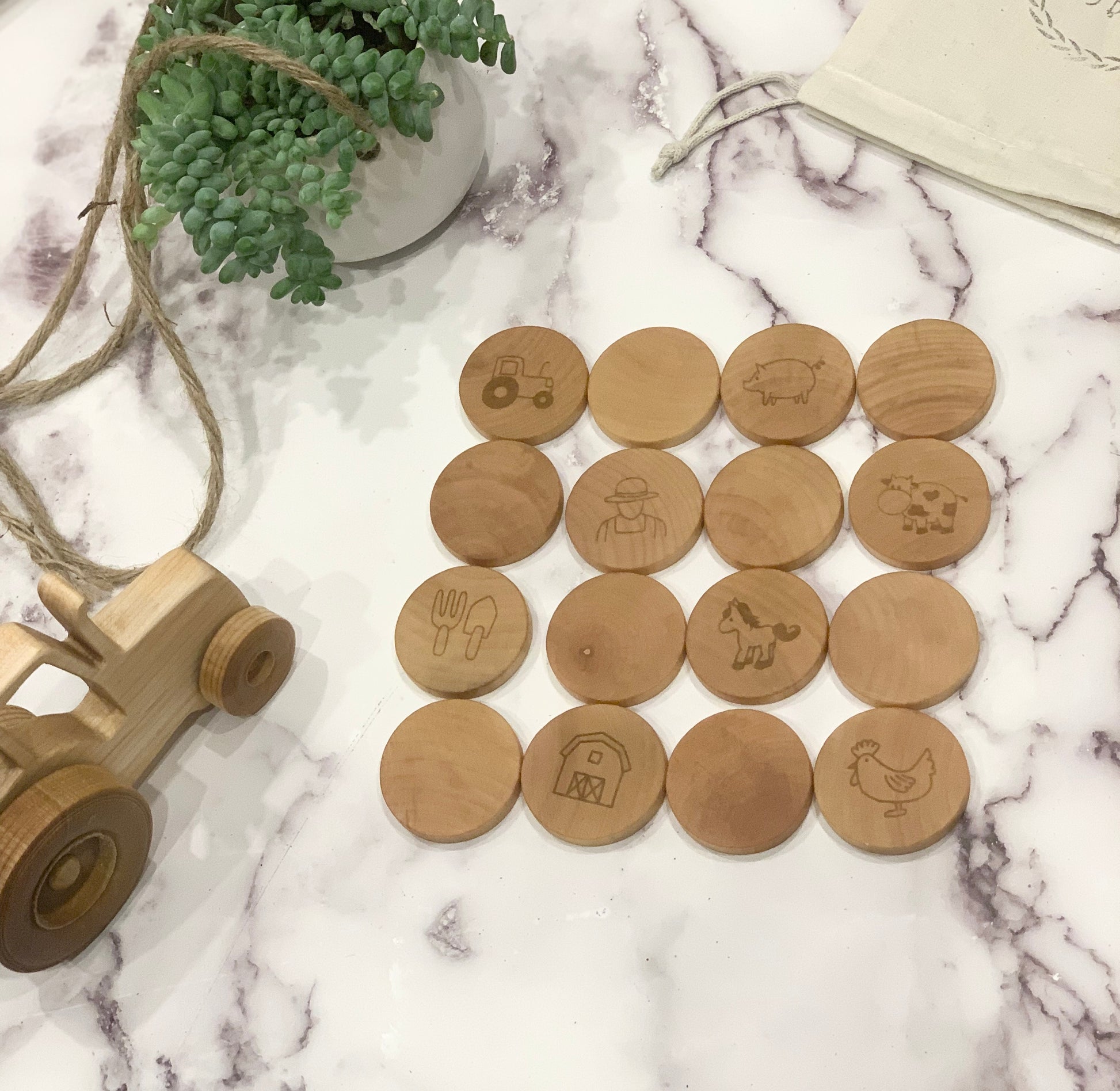 Each set comes with 16 wood coins (8 pairs of matching images), and a drawstring bag.