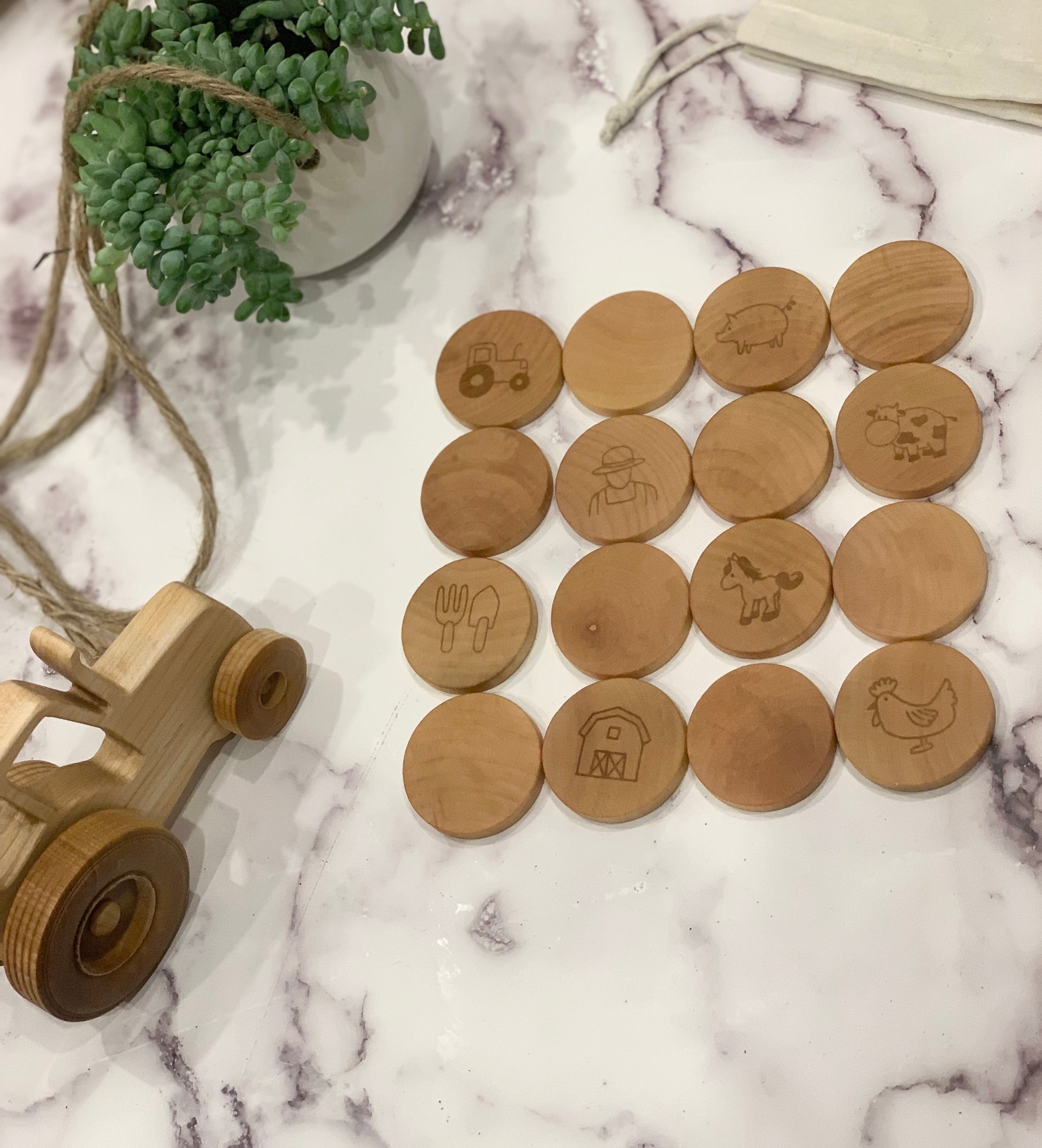 Memory games are a perfect educational toy for your little ones! In addition to using them as a traditional memory game - use them as little storytelling coins ⚡️🌈. Each time you pull a coin out of the bag - add a new sentence to your story, using the image as inspiration. Or - make musical & rhythmic sounds by tapping them together or plopping them into an empty Kleenex box. The possibilities are endless. These are wood burned with a laser machine and coated in a non toxic wood oil — completely eco friendly long lasting heirloom toys 🌿. Oh, and made with the most love ❤️