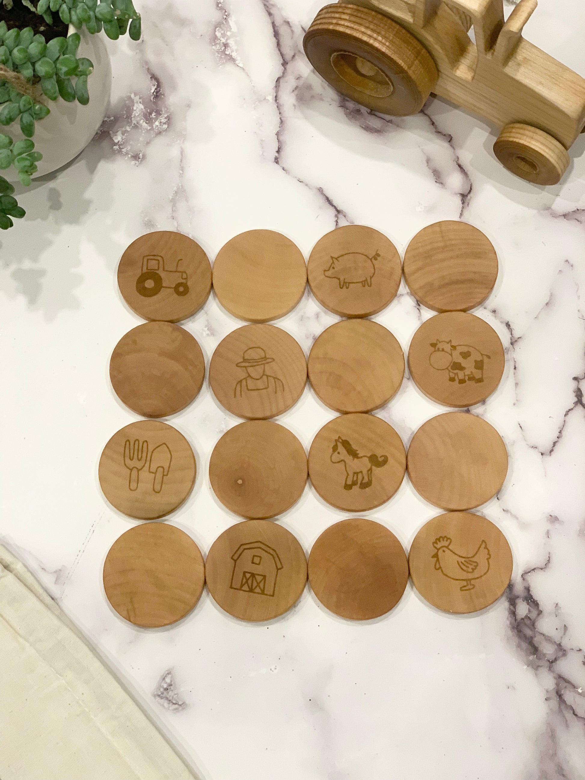All images are laser burned into the wood, creating a permanent non toxic image. Order a set today to keep your little one busy.