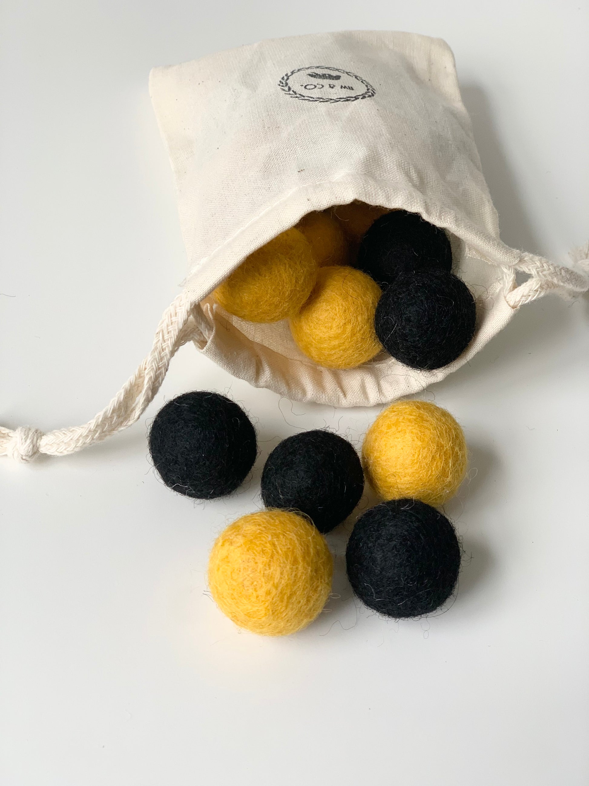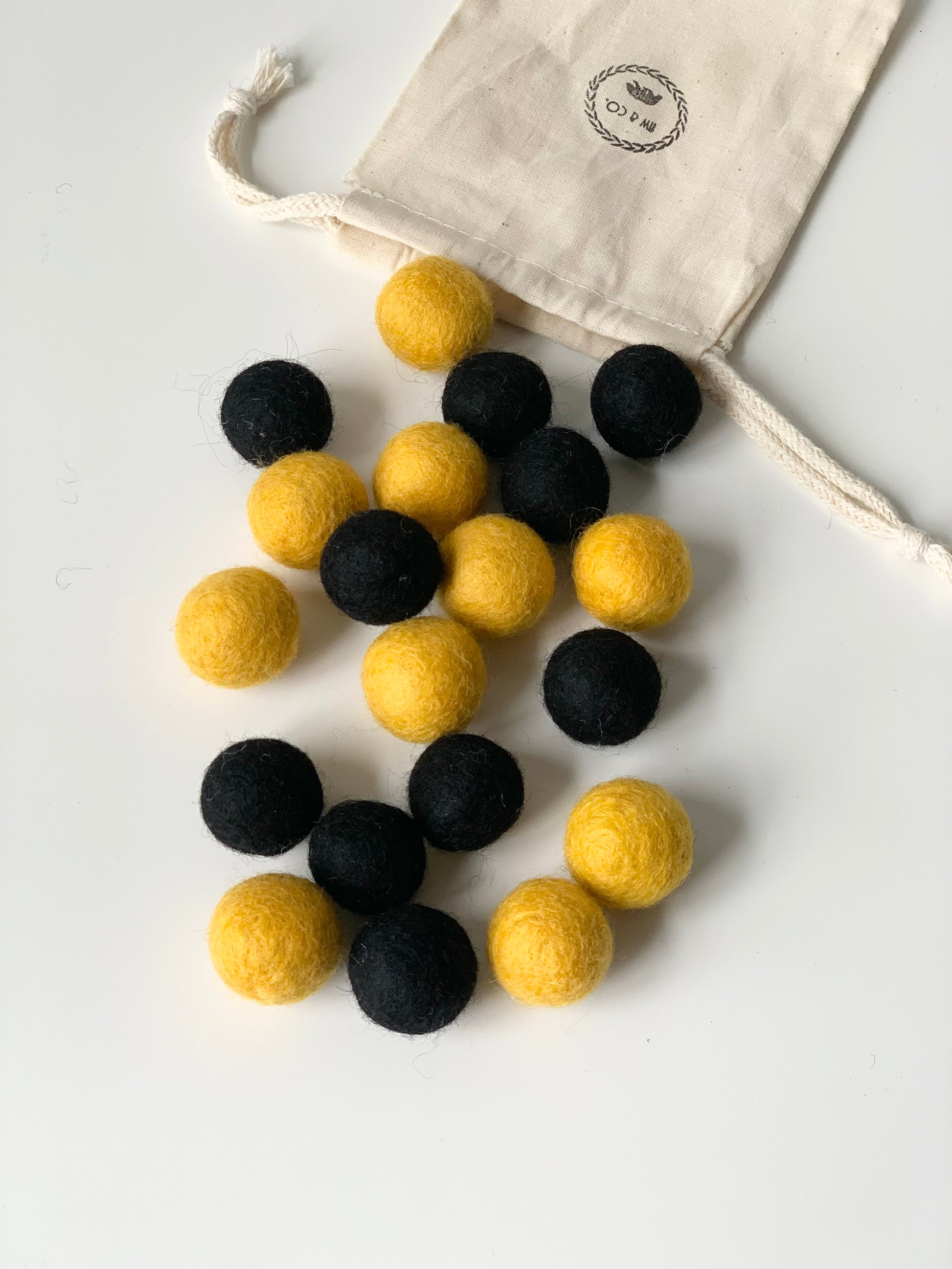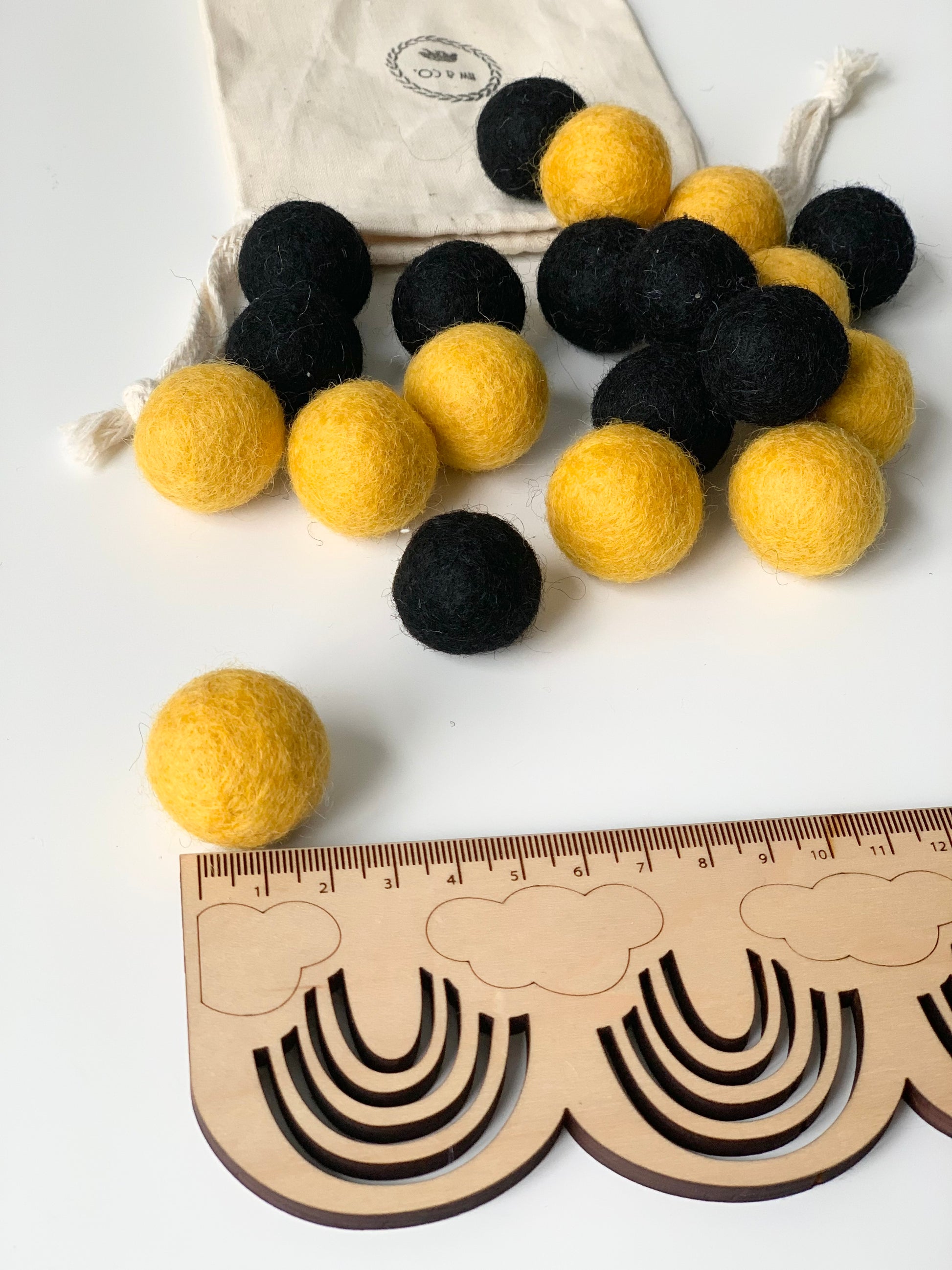 18 felt balls. Each ball is approximately 1.7-2.2cm in size. 9 of each colour.