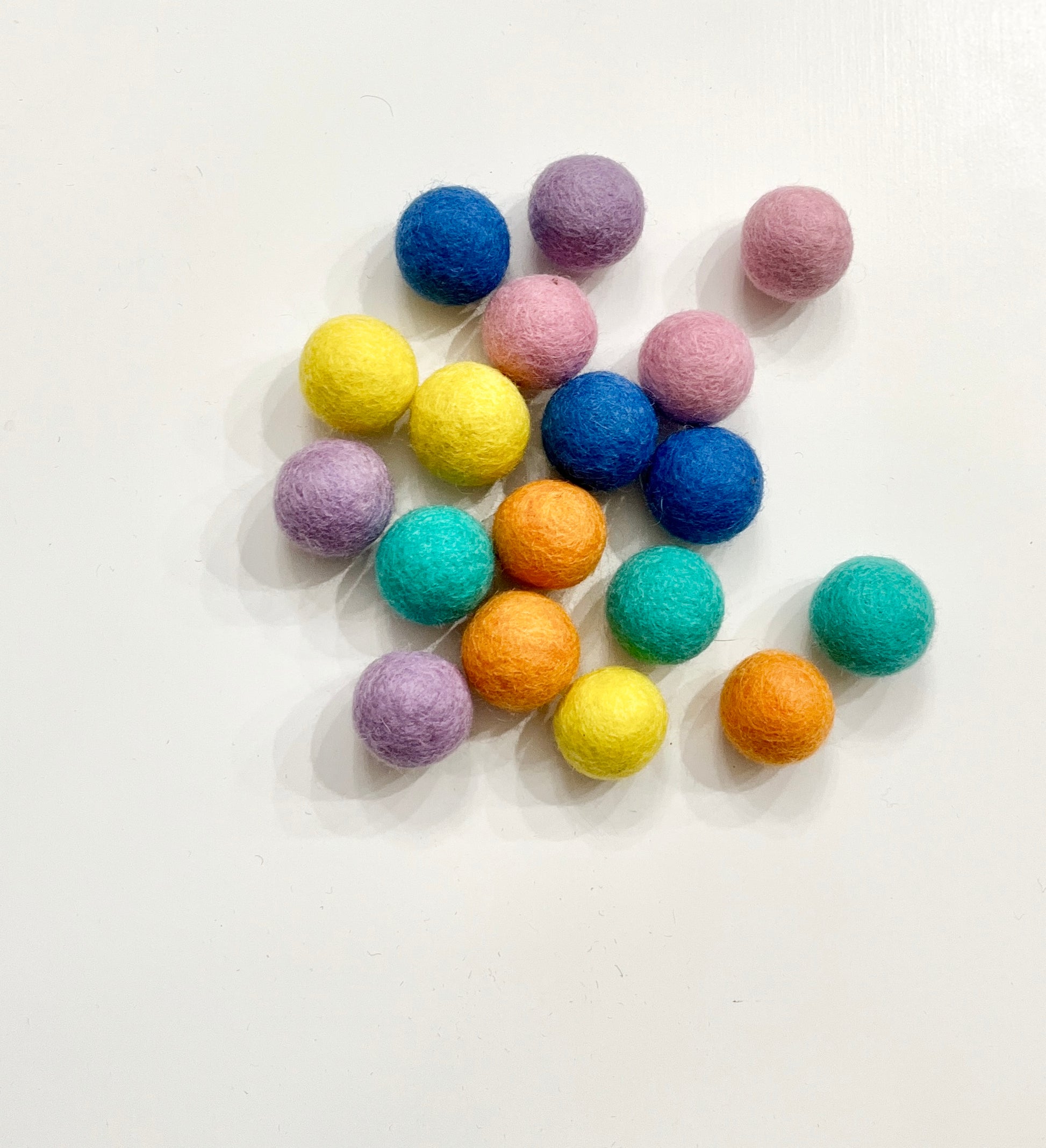 18 felt balls. Each ball is approximately 1.8-2.2cm in size. You will receive an assortment of the colours shown.