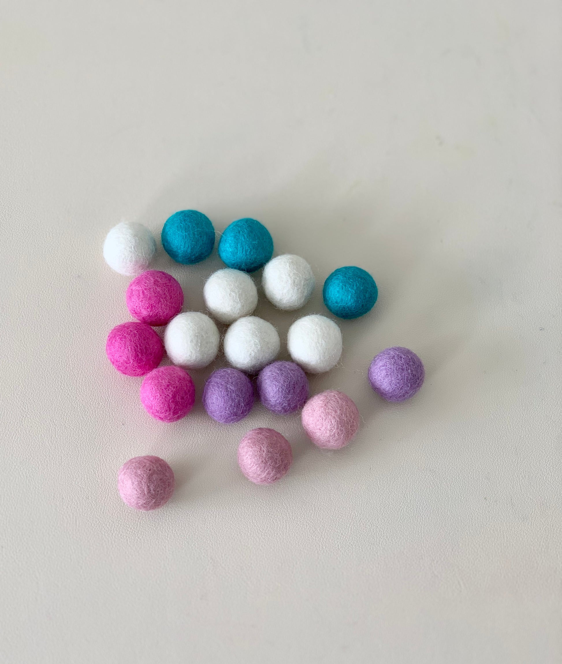 18 felt balls. Each ball is approximately 1.8-2.2cm in size. You will receive an assortment of the pastel colours shown. Quantities of each colour will vary, but no less than 2 colours of each will be included.