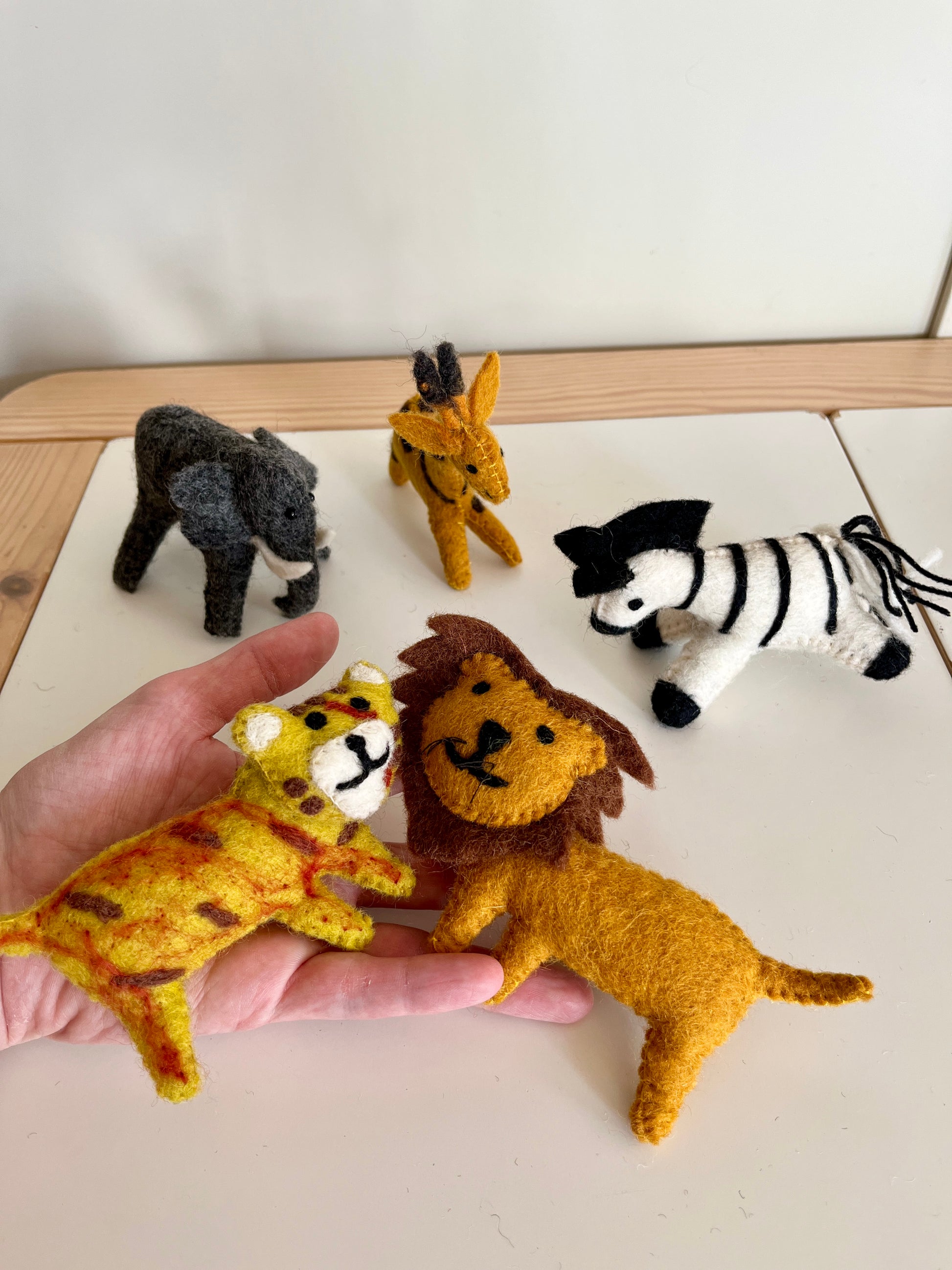 A full set comes with everything shown. Each item is handmade, fair trade from Nepal, 100% pure organic wool. Giraffe, Zebra, Elephant, Tiger and Lion