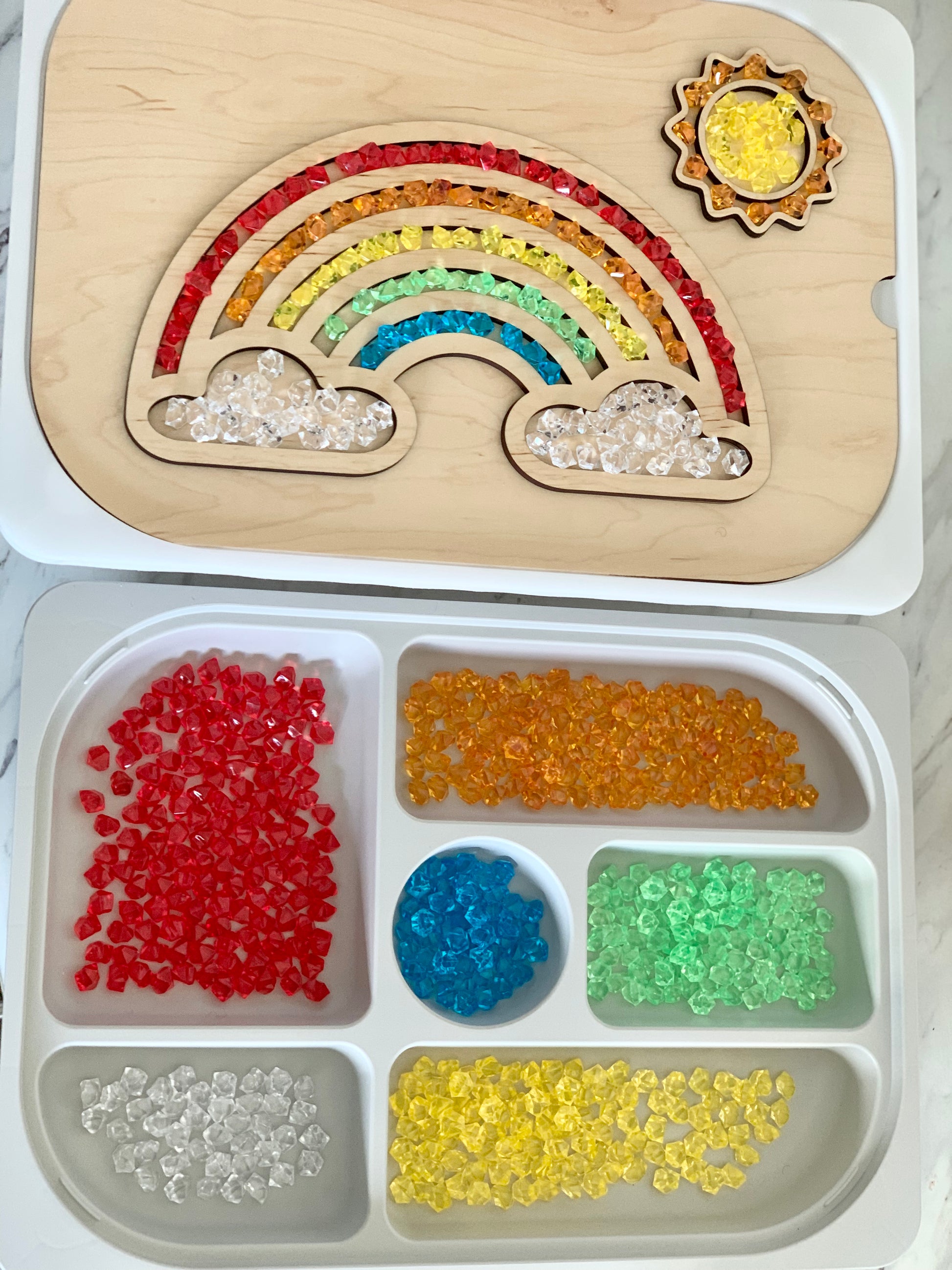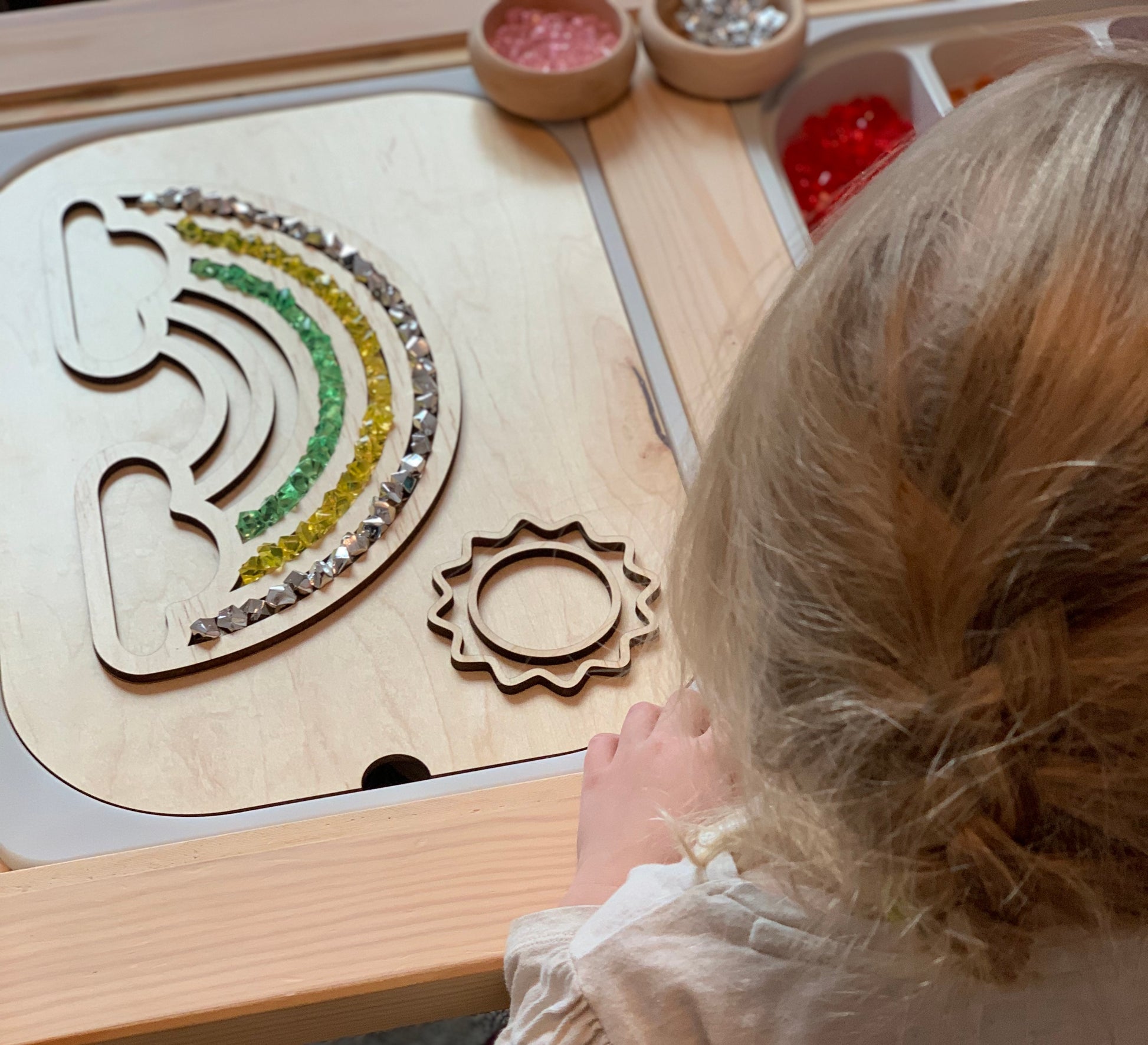These Flisat inserts/table tops are made to fit the large Flisat bins. The large rainbow arch takes approximately 35 of our acrylic gems to fill.
