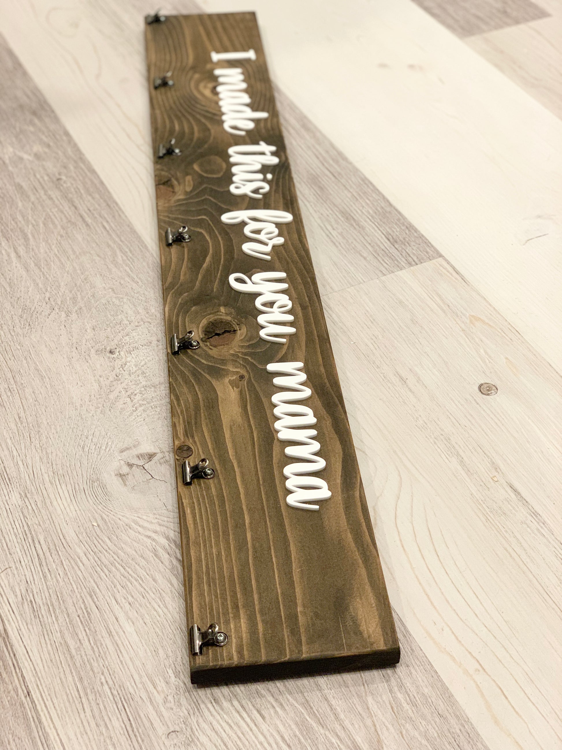 5.5 inches high by 24, 30, 36 inches long with beautiful 3D acrylic lettering. It comes with sturdy, metal clips that are screwed into the board. The clothspins on our old one broke pretty quickly, so we used metal for our new style board. The board is stained or painted in your choice of finish. It can say anything you would like it to. “We” or “I” made this for you , Look what I/we made — anything is available. To customize your sign — Please write your design notes in the personalization details area.