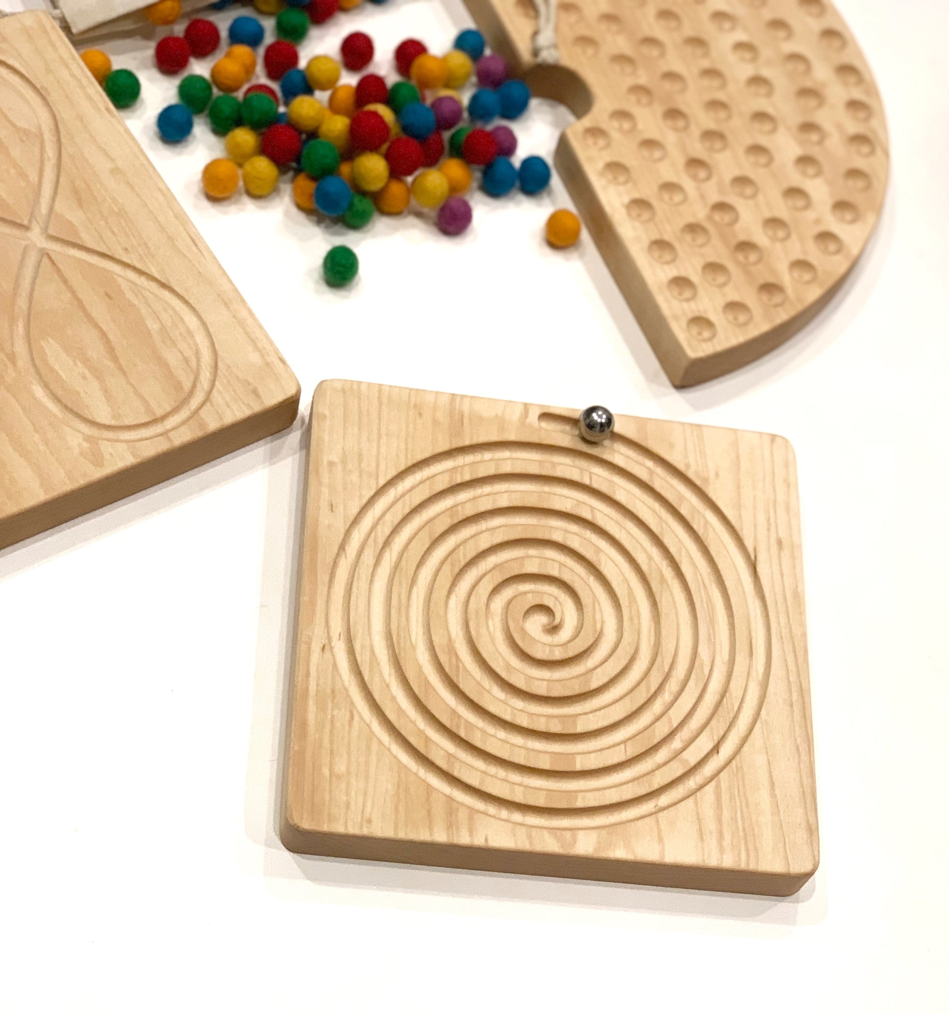 These tracing boards are a fantastic way to help your child with anxiety and relieving emotional stress. A few minutes each day practicing can promote their focus, practice breathing and staying calm. It is also a great early introduction to writing and educational play! Use your ball or a stylus/finger to follow the engraved lines, or utilize rice or dough to play with it as a sensory board.