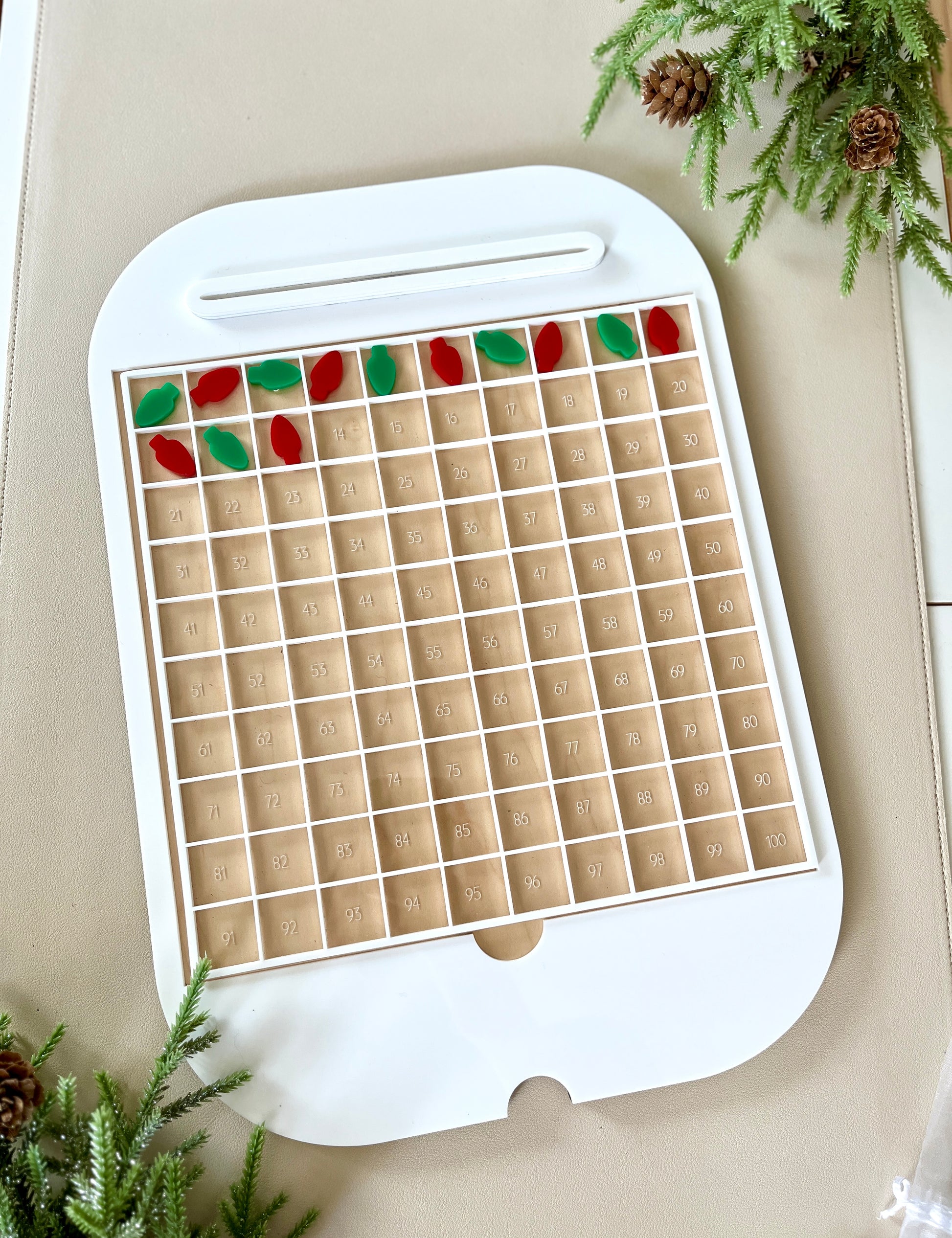 Beautiful acrylic hundred board crafted completely in house. Use to help with hand eye coordination, early math, early coding, counting, sorting, sensory play, learning colours and more.