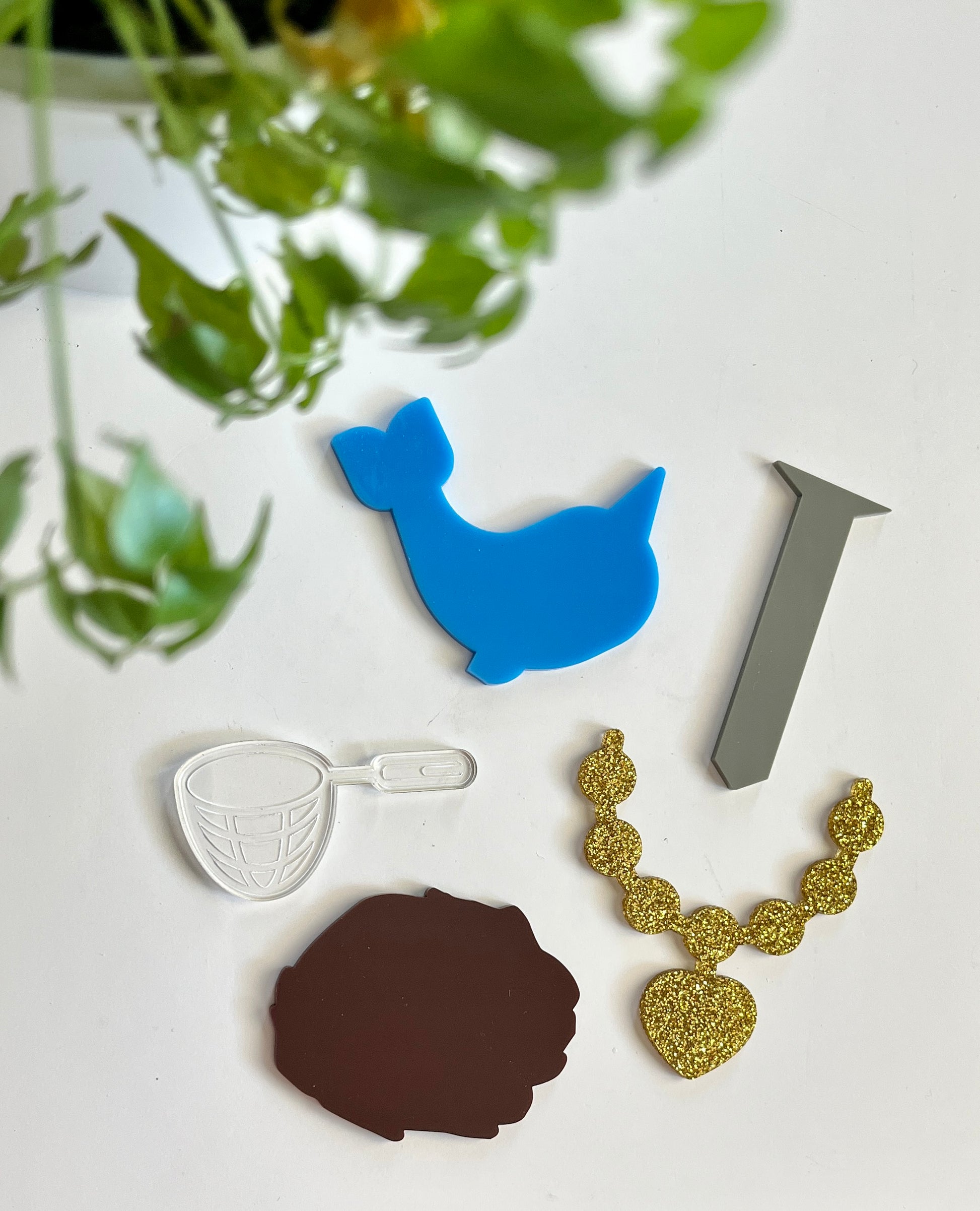 N – brown nest, gold necklace, clear (engraved on back) net (like a butterfly net), grey nail, blue narwal