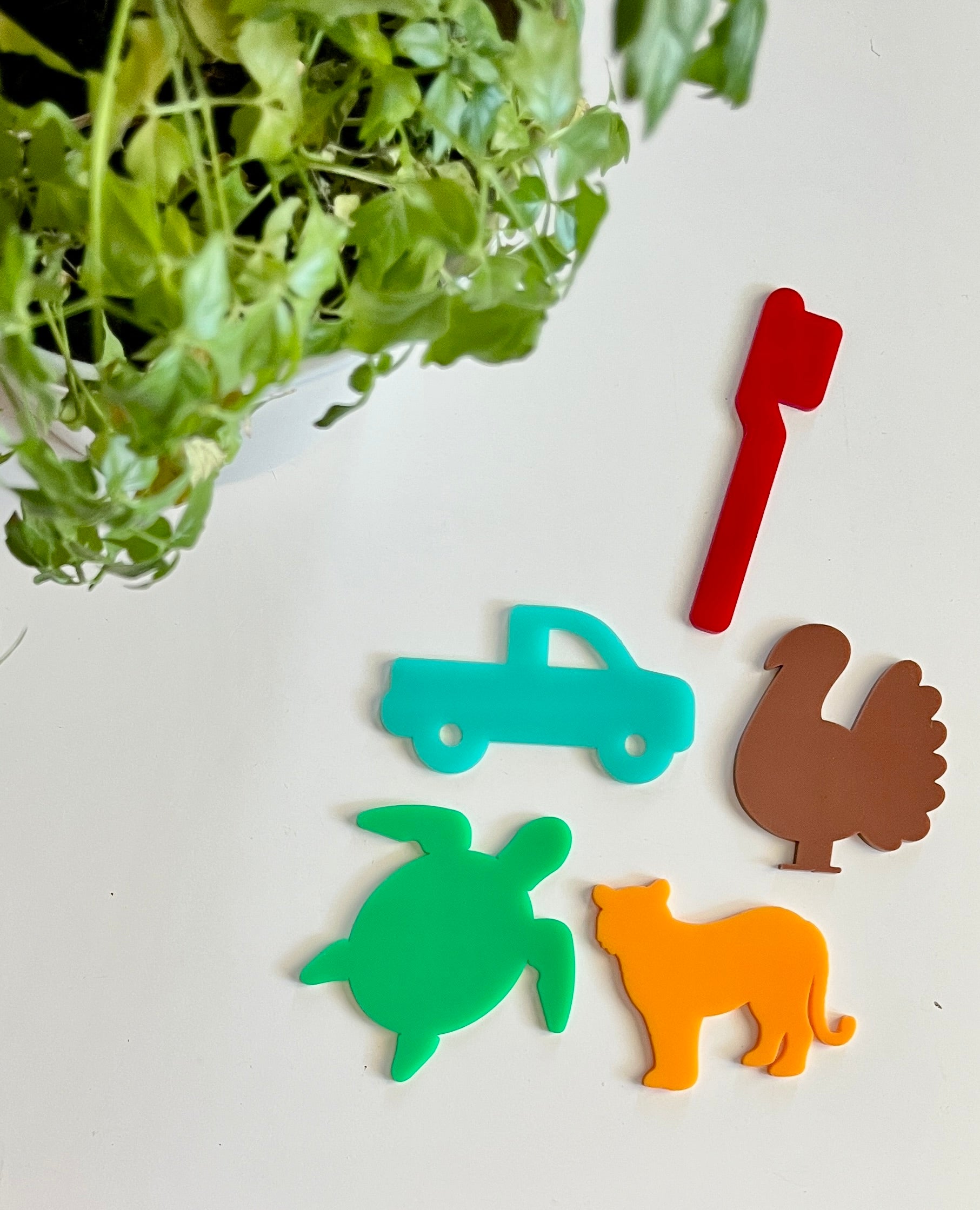 T – green turtle, teal blue truck, brown turkey, orange tiger, red toothbrush