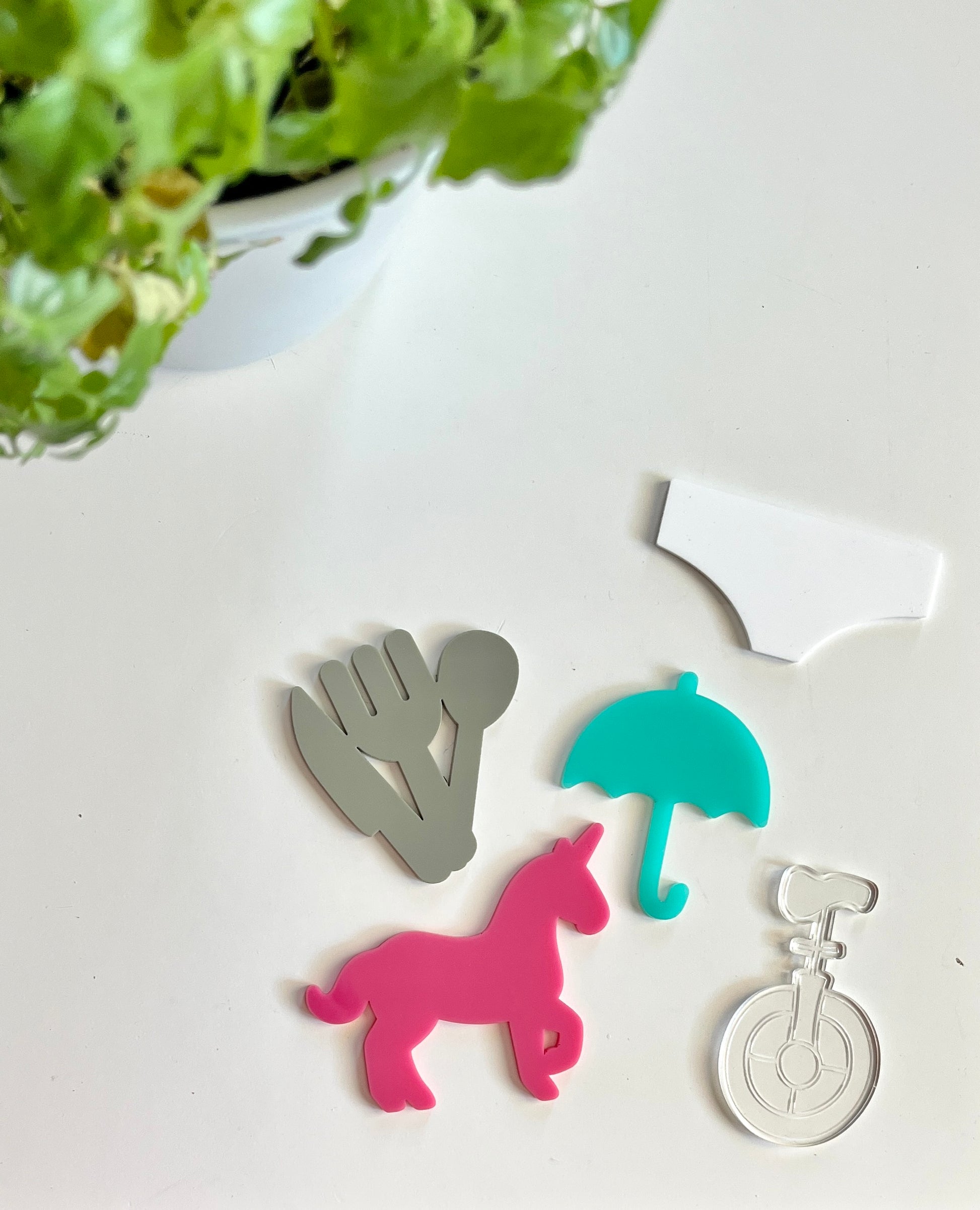 U – teal blue umbrella, pink unicorn, grey utensils (fork spoon knife all attached), white underwear, clear (engraved on back) unicycle