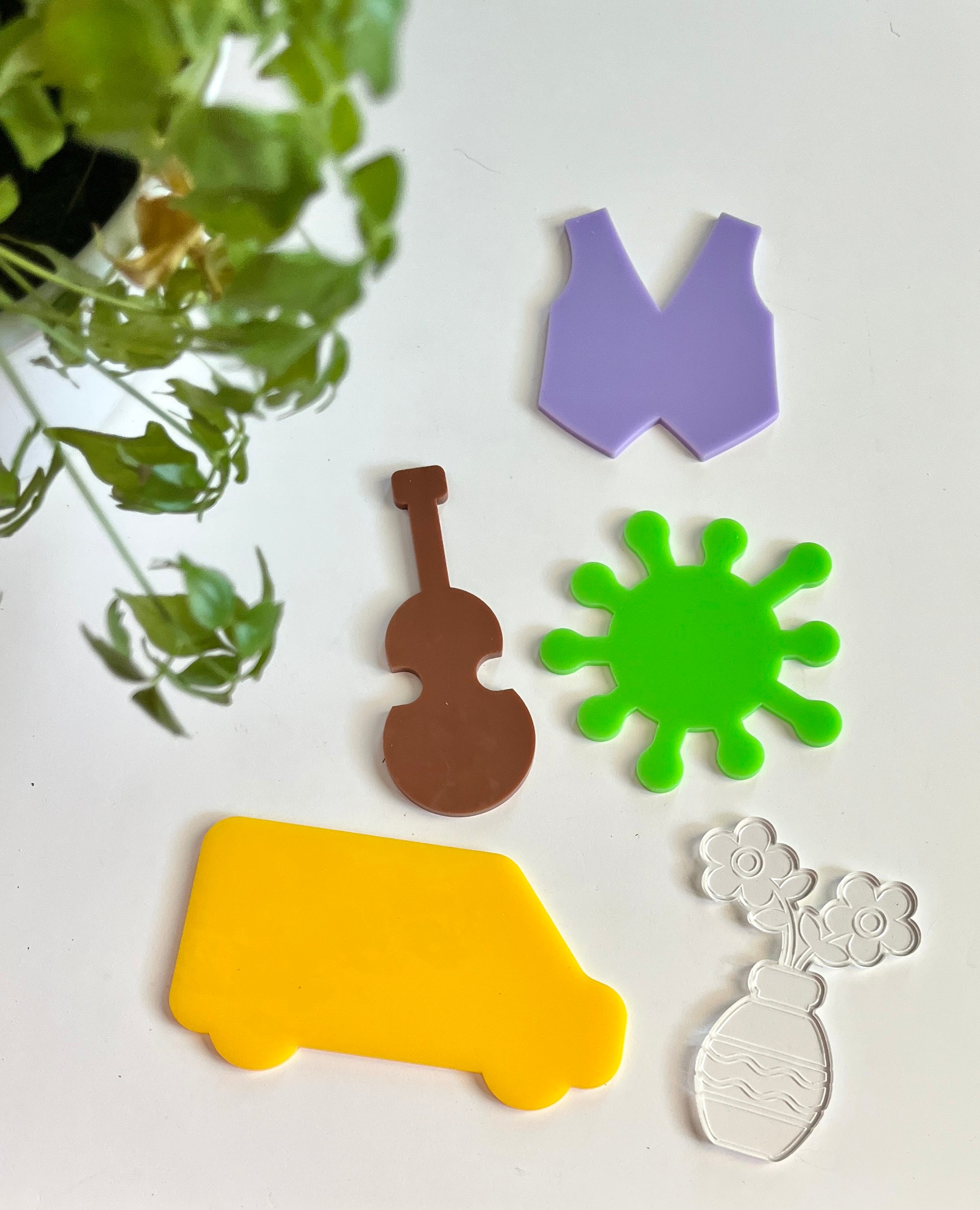 V – yellow van, brown violin, purple vest, engraved clear vase, lime green virus germ shape