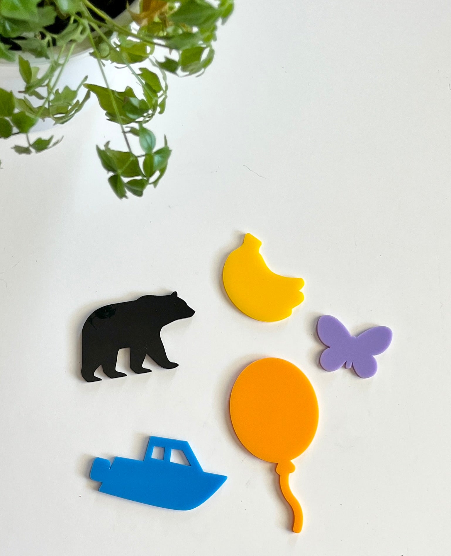 B – yellow bananas, purple butterfly, blue boat, black bear, orange balloon