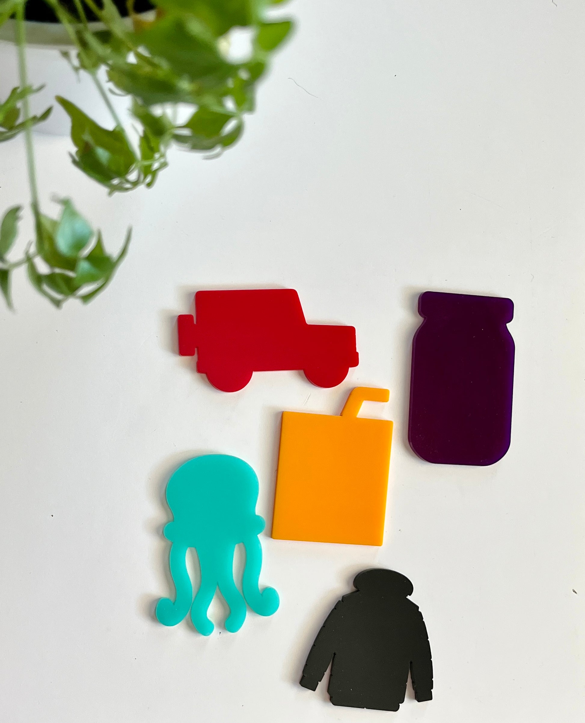 J – teal blue jellyfish, dark purple jar, black jacket, red jeep, orange juice
