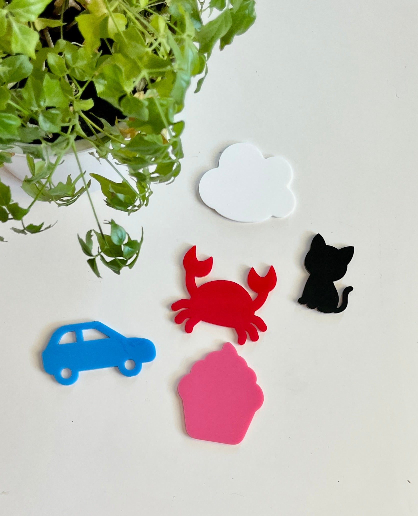 C – black cat, blue car, pink cupcake, red crab, white cloud